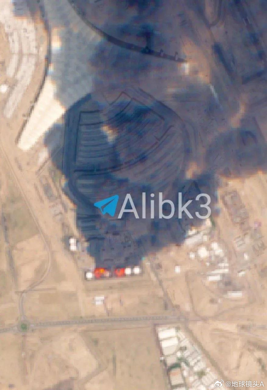 伊朗反击或大规模升级 遭伊朗无人机打击的科威特国际机场。航空燃料罐被击中燃烧猛烈。