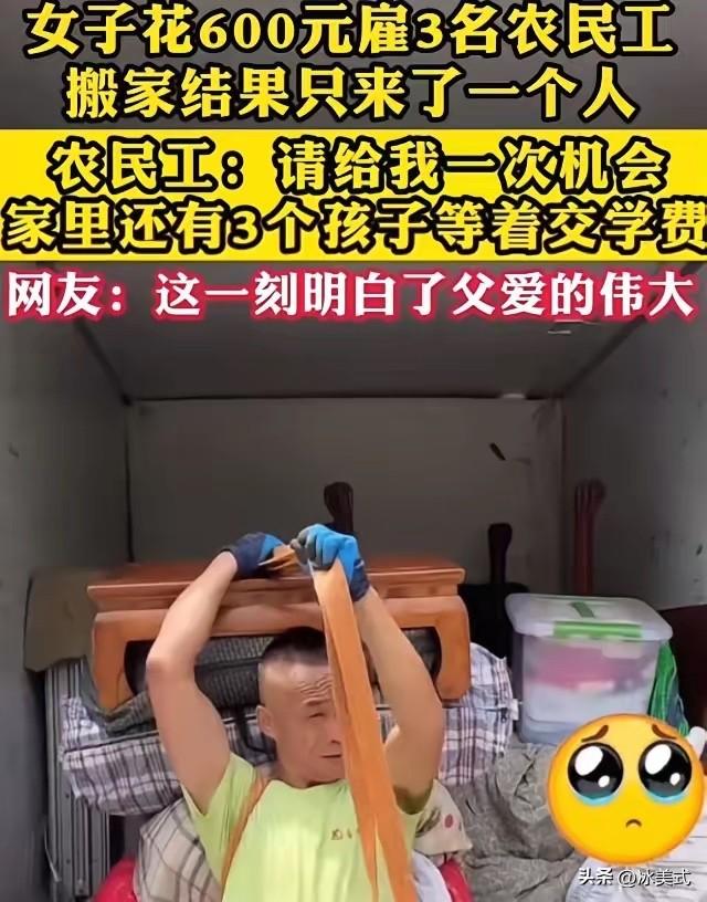 看哭了!因为搬家公司收费太高,女子花600 元雇 3 名农民工搬家,结果对方只来了一个人!女子气坏了,觉得农民工欺骗自己,可没想到农民工说:“请给我一次机会,我家里还有 3 个孩子等着交学费!”