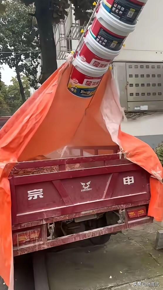 工友们都看呆了,赶紧围上来试。碎砖袋子、水泥块袋子,只要不是特别沉的,都能顺着桶子滑下去,速度快得很,还不洒渣子。以前扛一袋到楼下要三分钟,现在往桶里一放,几秒钟就到了。