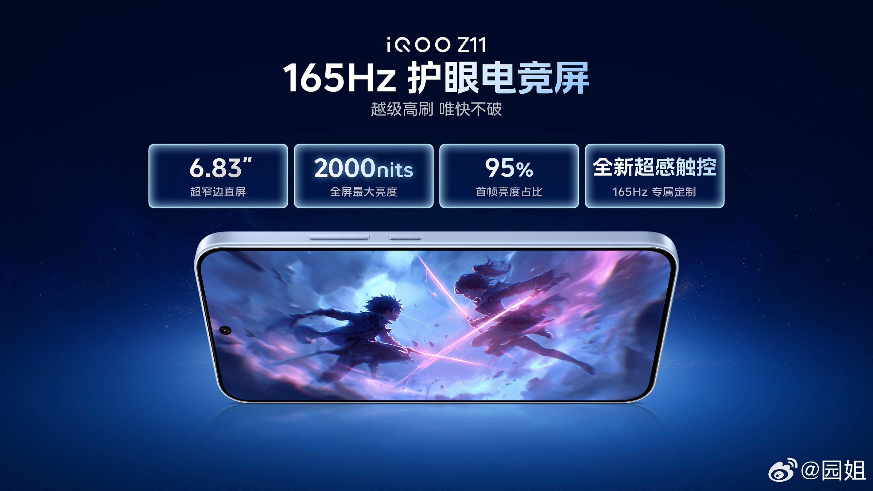 iQOO Z11有沧浪浮光,天光白和极夜黑三款配色。外观采用悬浮舷窗、大R角和视觉四等边设计,搭载iQOO首款165Hz护眼电竞屏,6.83英寸超窄边直屏,全局最大亮度2000nits。