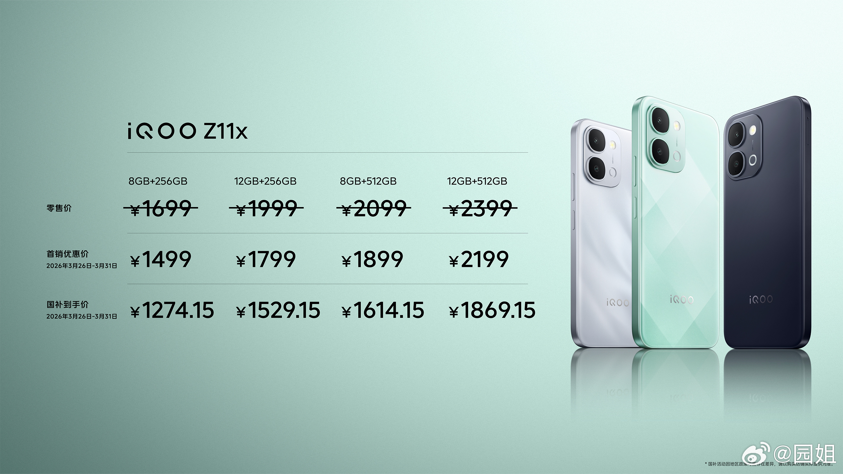 iQOO Z11发布即开售,售价2299元起,首销优惠价1999元起,国补到手价1699.15元起;iQOO Z11x售价1699元起,首销期优惠价1499元起,国补到手价1274.15元起。
