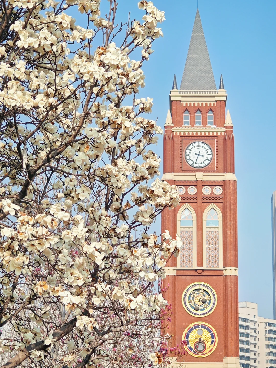与钟楼同框,白玉兰开的好,紫玉兰是花苞