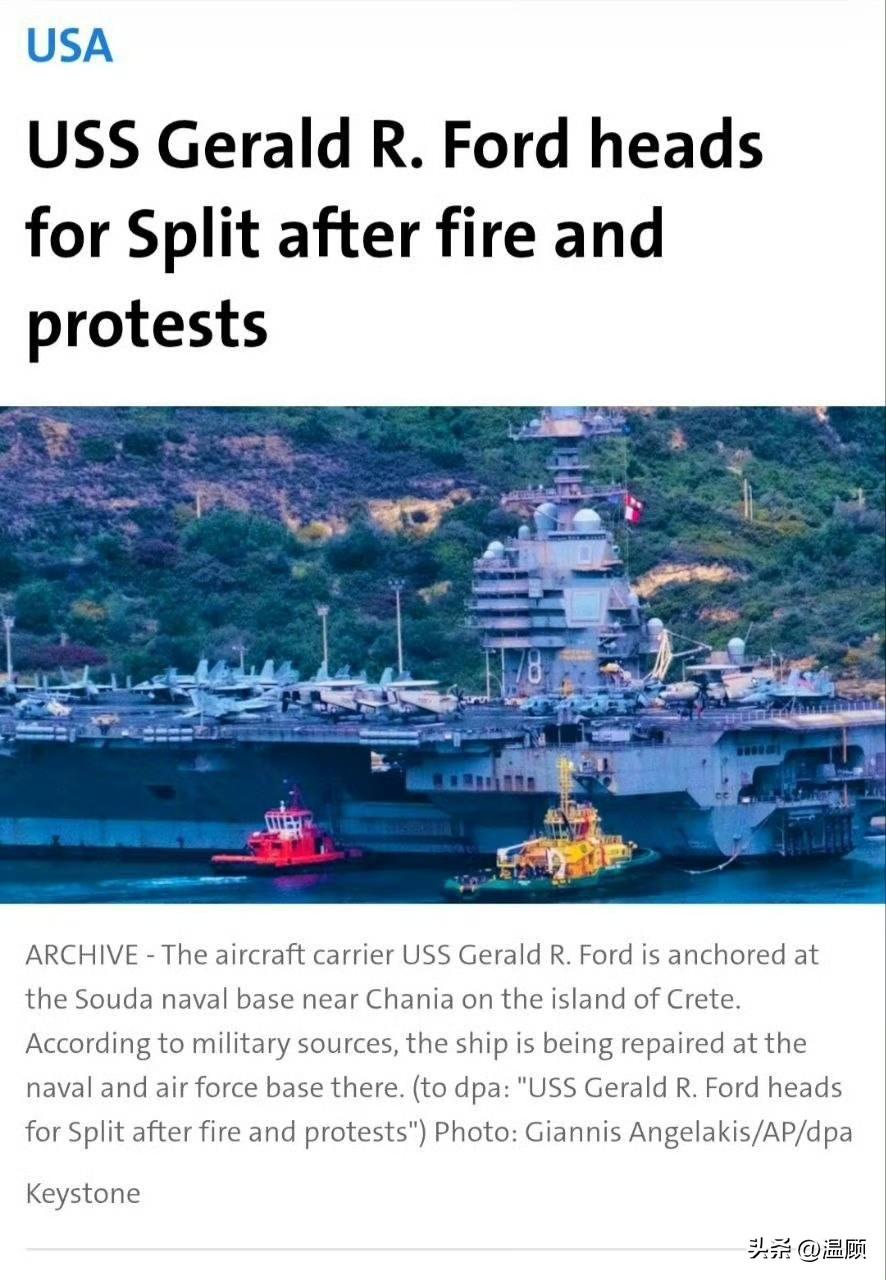 福特号“转院”了…多家外媒及卫星图像证实,此前在红海发生洗衣房火灾的美军福特号航母,已从希腊苏达湾驶离“转院”前往克罗地亚斯普利特进行进一步维修。