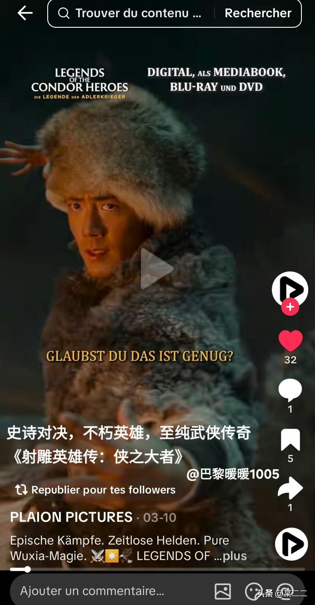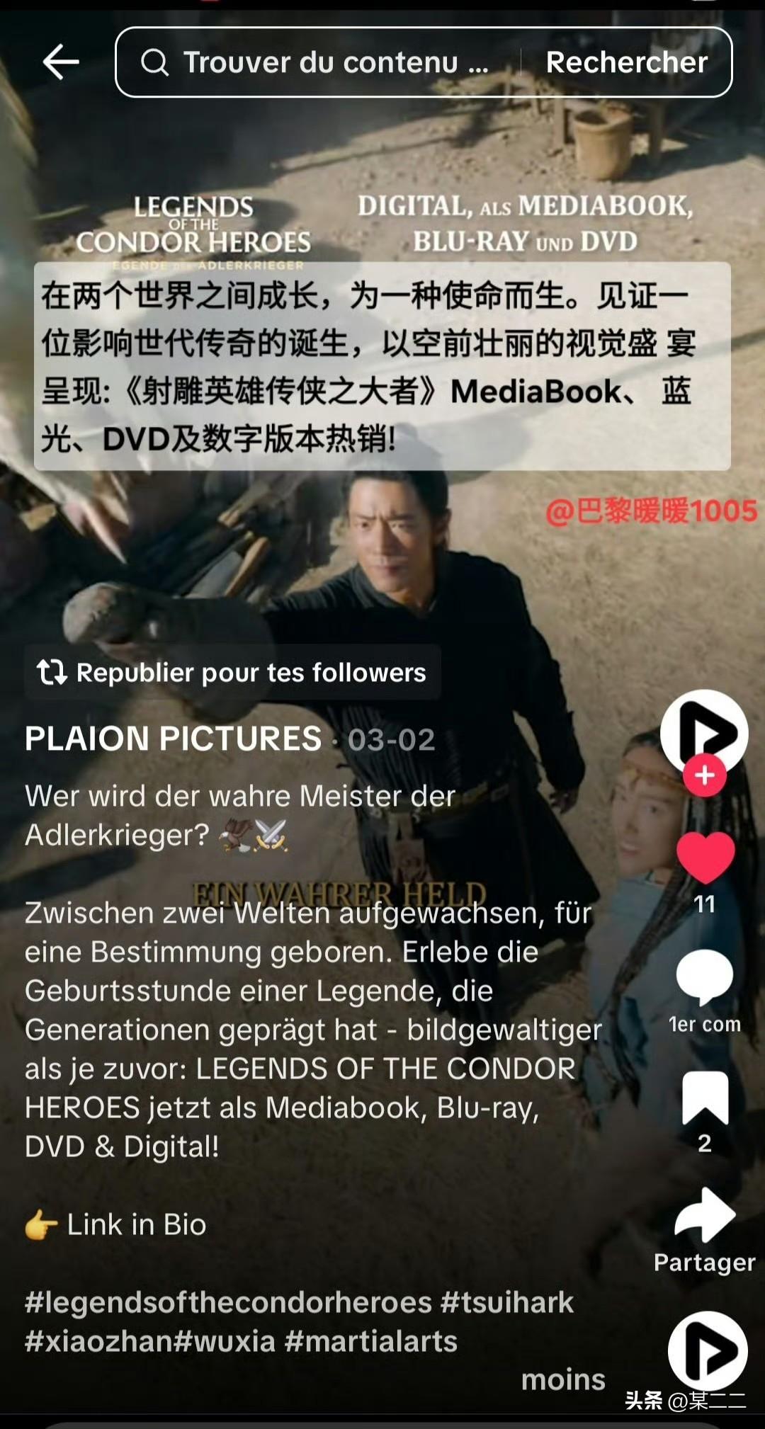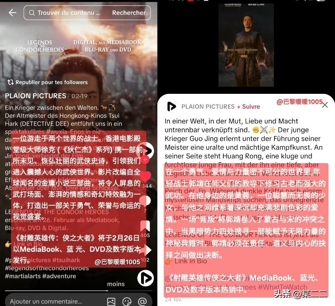 《射雕英雄传:侠之大者》已由德国发行商 Plaion Pictures 推出MediaBook、蓝光、DVD及数字版本!德语配音版的射雕战争场面好震撼!气势磅礴,充满魔幻色彩。预告片从配乐到剪辑都相当入味,搭配德语解说与配音,非常有魔幻大片的质感。