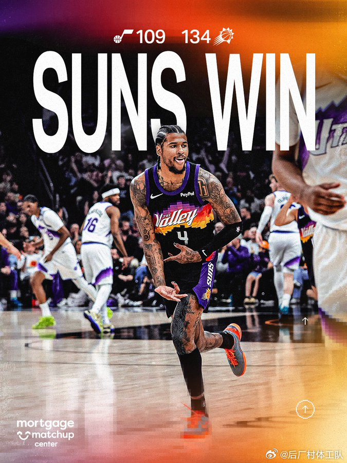 太阳134-109大胜爵士,太阳在第一节便因为爵士的离谱失误拉开了分差,这场比赛早早就进入了垃圾时间,太阳方面,格林31分6板3助、布克26分3板8助、阿伦19分3板3助2断;爵士方面,菲利波夫斯基26分9板3助2断、森萨博26分2板2助、米哈伊柳克14分2板1助。