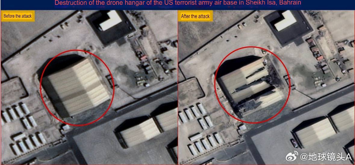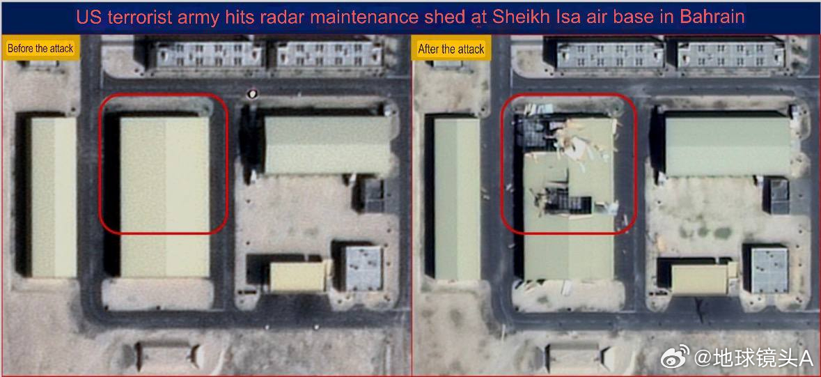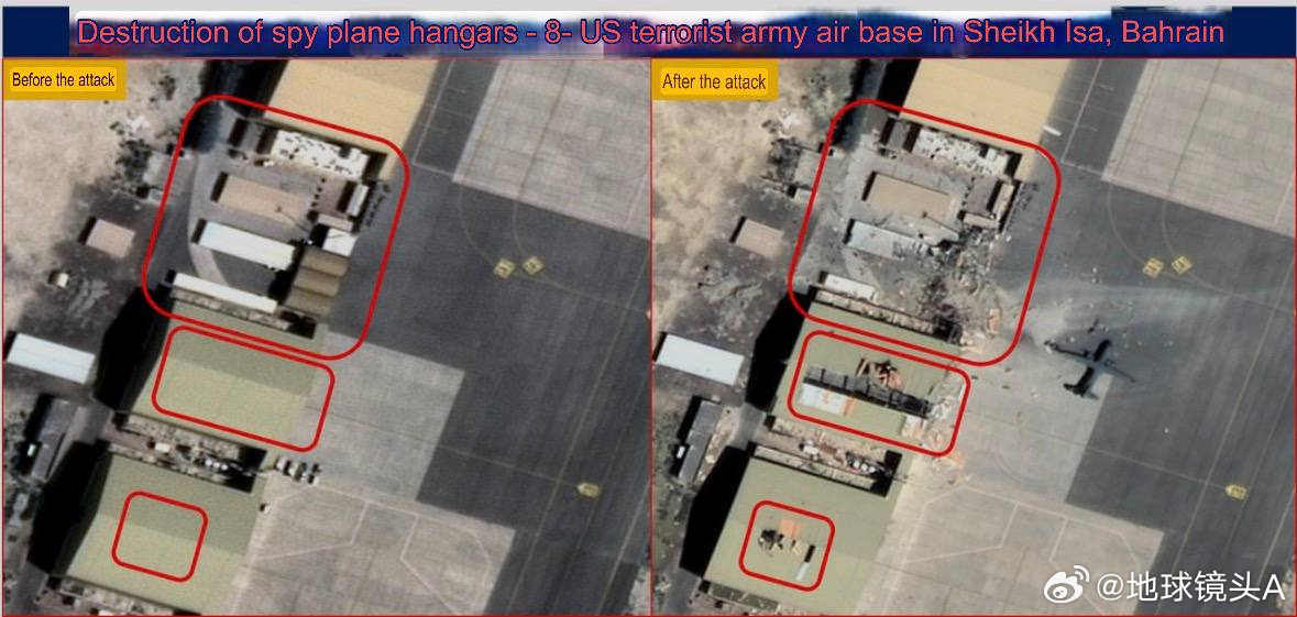 伊朗公布新的卫星图像,显示了29日对巴林美空军基地实施打击后造成的破坏:—— 巴林谢赫伊萨美空军基地雷达维修车间被打击。—— 位于巴林谢赫伊萨的美空军基地 8 号侦察机机库被摧毁(边上一架大型机是否受损未知) 。—— 位于巴林谢赫伊萨的美军基地的无人机机库被摧毁。—— 位于巴林谢赫伊萨的美空军基地的设备仓库被摧毁