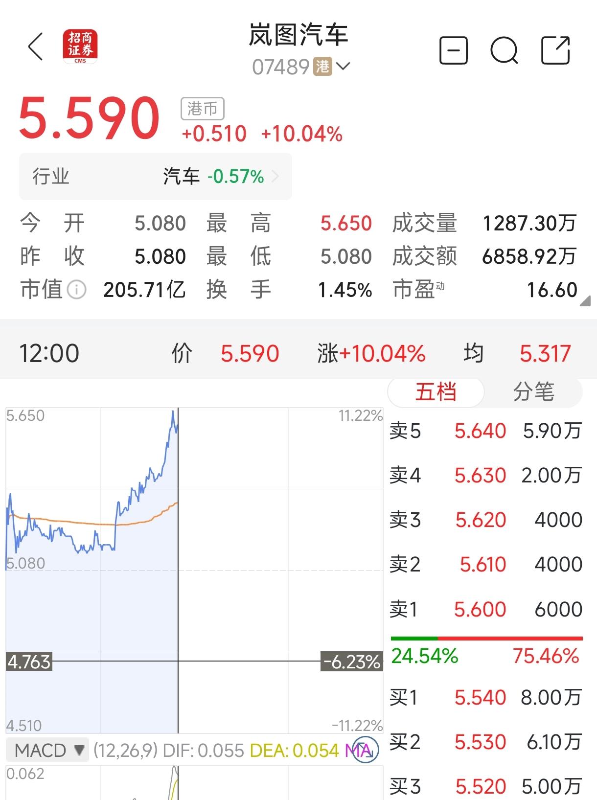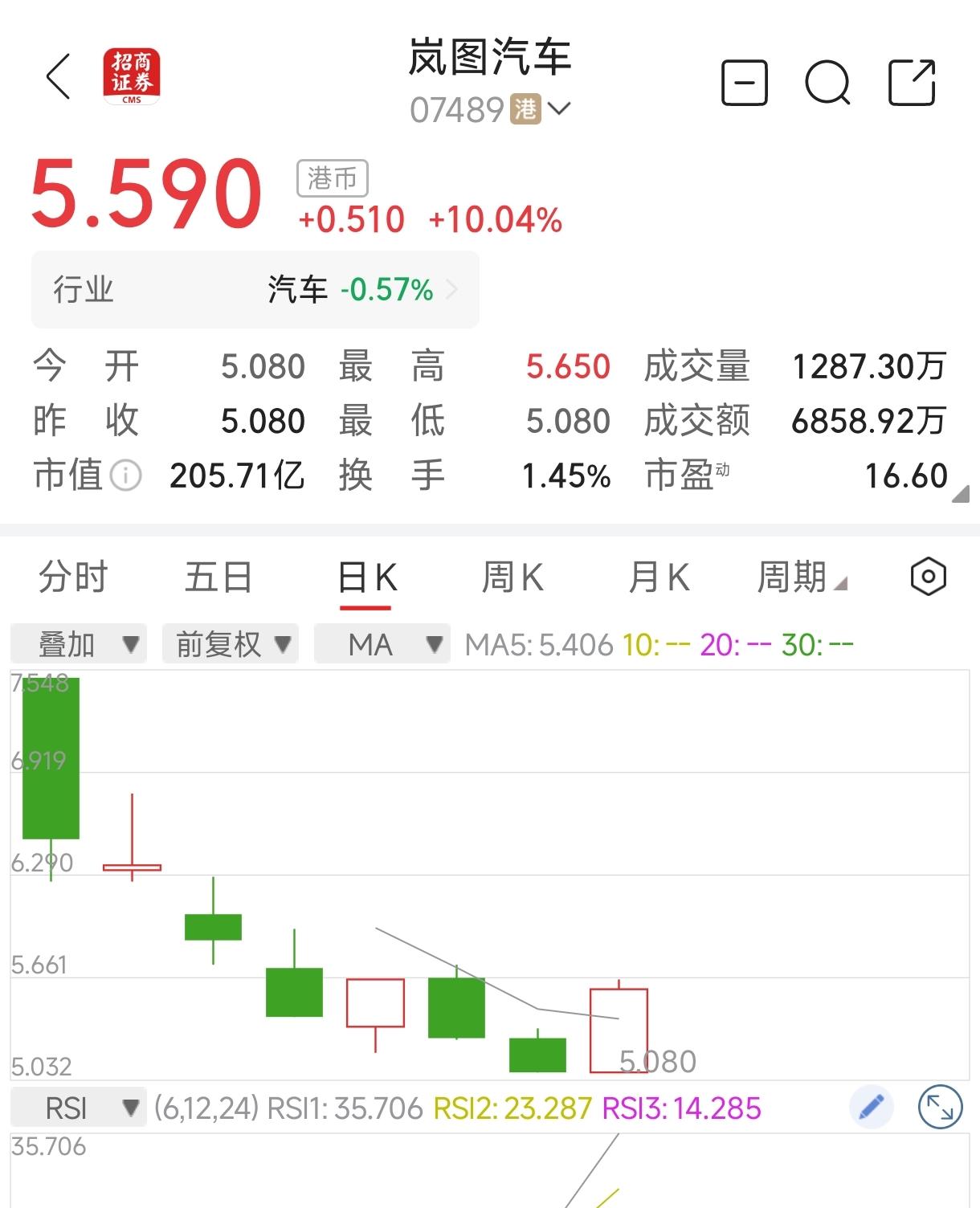 快讯,岚图汽车股价大涨10%,当前成交价5.59港元,市值205港元。