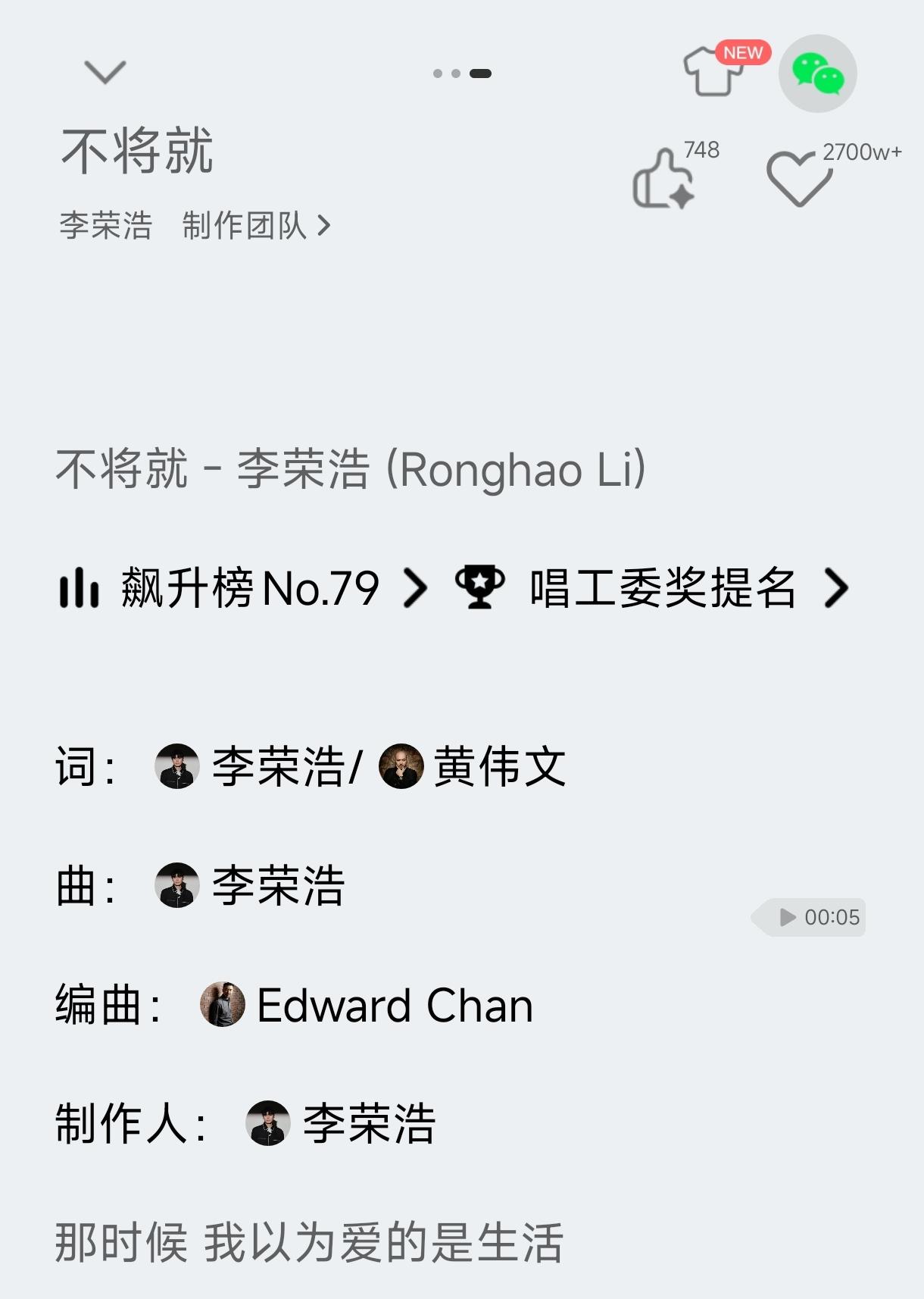 一部分粉丝大言不惭说说单依纯带红了李荣浩和李荣浩的歌,他们怕是忘了李荣浩是单依纯出道节目的导师。我个人不是李荣浩的粉丝但有付费下载他的歌,《老街》《不将就》《乌梅子酱》(反而没有下载《李白》)。他有很多歌在腾讯音乐的收藏量都是超过1000万的,可能有些粉丝过于低龄吧,说话真是没有天高地厚的意思。