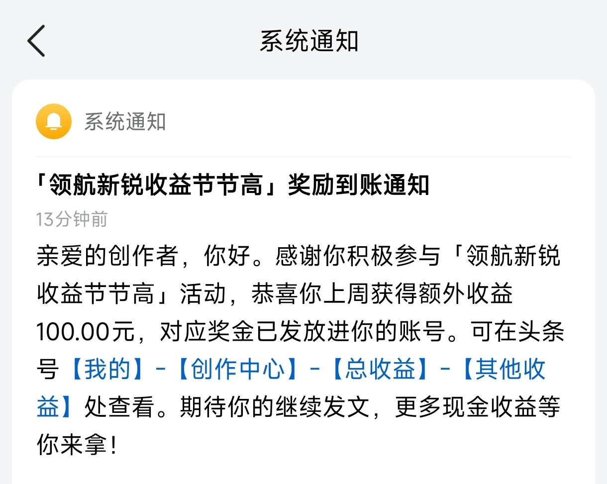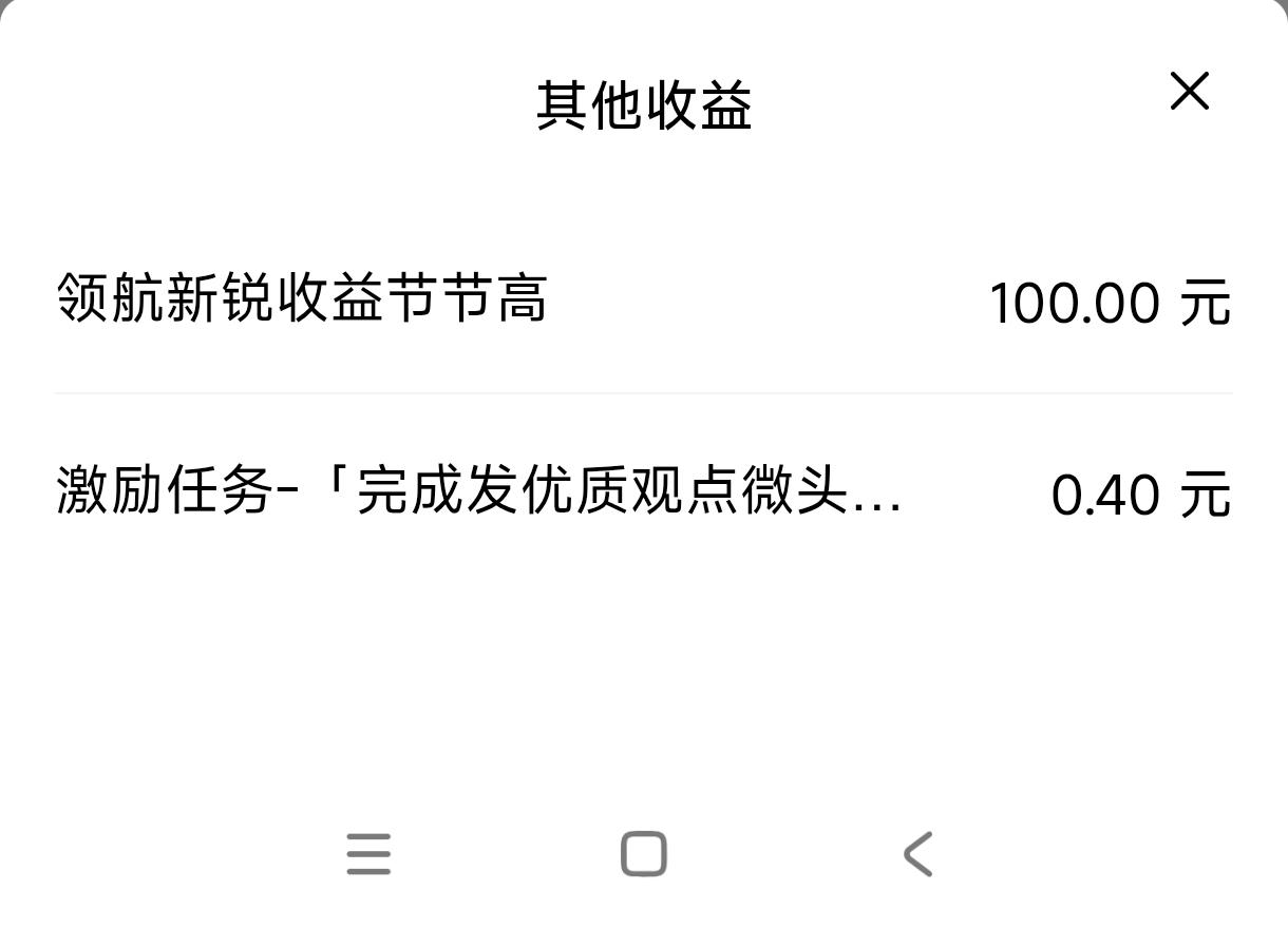 刚刚收到领航新锐收益节节高的活动收益100块,本周账户累计349.51元,满意。