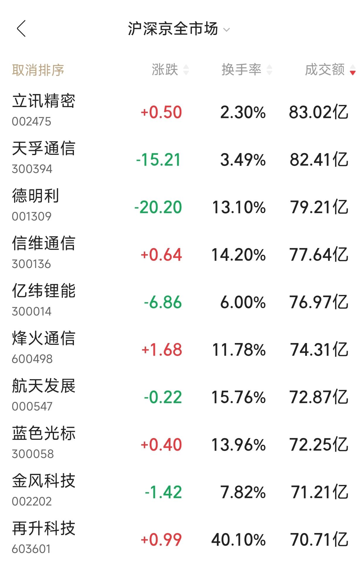 成交额第11~20名依次是:立讯精密,天孚通信,德明利,信维通信,亿纬锂能,烽火通信,航天发展,蓝色光标,金风科技,再升科技等,中天科技、长飞光纤、赣锋锂业、比亚迪等公司成交额紧随其后。今日A股 中际旭创 中际旭创