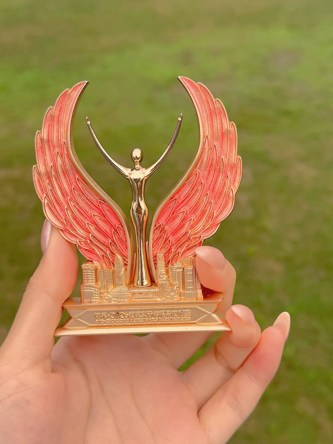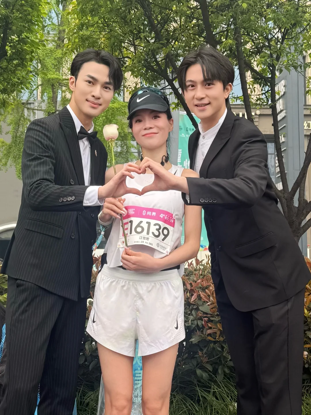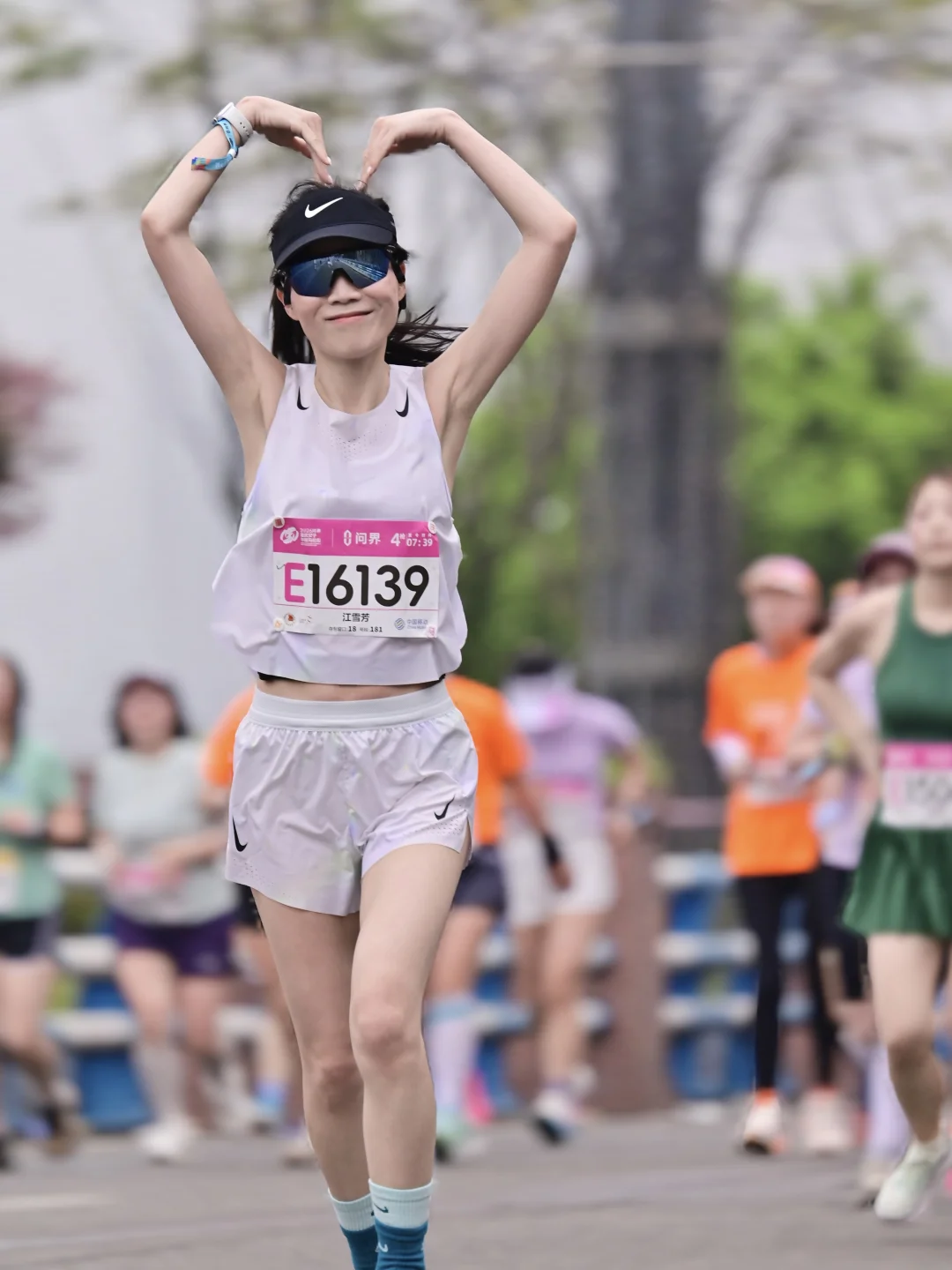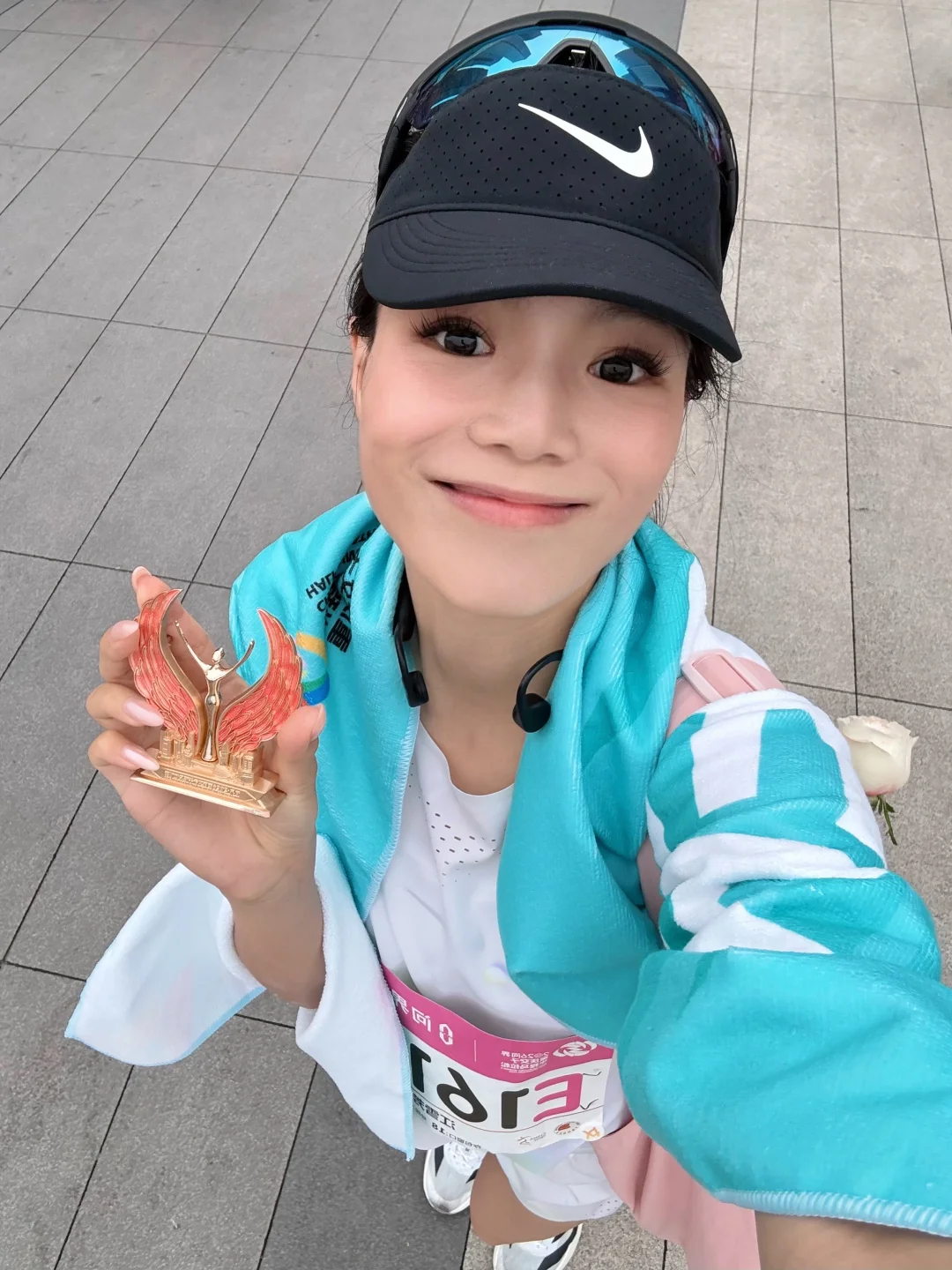 😆开跑还是会兴奋,但也知道不能太快,把力气留给最后四公里冲刺,最后跑出了比之前更好的配速,但心率还是高,但顺利安全完赛就很好啦!感谢3月29日的自己,能够起床跑步完成21公里!冲线之后会得到一朵鲜花、可以自己选喜欢的帅哥合影,还有一块很漂亮的完赛奖牌。我很喜欢重庆女子半马奖牌,女性雕塑双手绽开的设计,像自由,也像无畏,有种很柔软、但很坚定的女性力量。这块奖牌更像一种“绽放”,强调女性你本来就很美也很有力量。