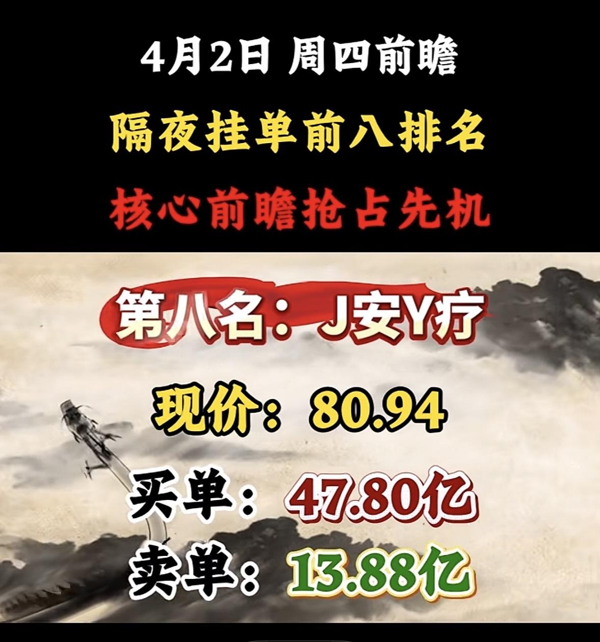不过隔夜挂单能解决操作提前量,方便白天忙或想提前规划交易的人。但券商接收隔夜委托时间不同,操作时得注意。就像3月9日的隔夜挂单数据,协鑫JC买单163.98亿,资金抢筹意愿强;拓维XX卖盘几乎被吸干,易走出加速行情。4月2日这前八名说不定也藏着大机会呢!