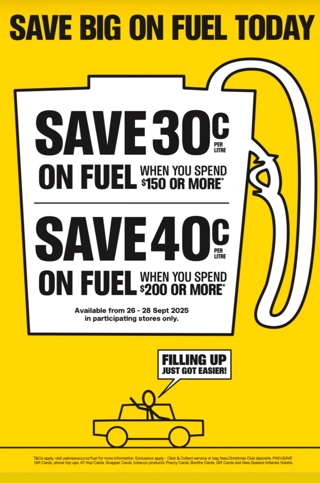 本周末(9月26日-28日)在PAK’nSAVE 购物,就能享受超给力的燃油折扣!💰