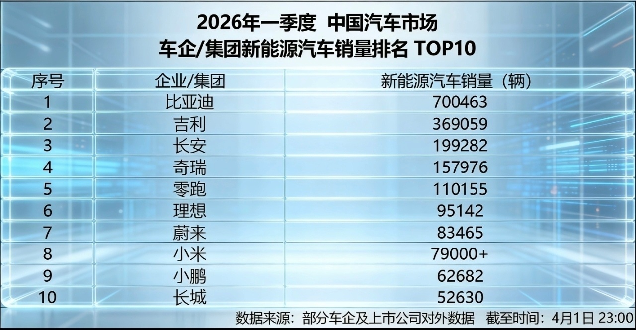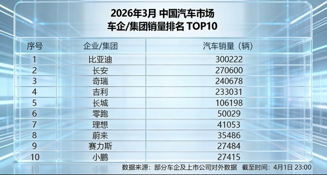 4月1日,比亚迪发布2026年3月产销数据,单月销量达300222辆,强势拿下中国车企销量冠军,同时以一季度700463辆的成绩,连续58个月蝉联中国新能源汽车销冠,"双冠王"的战绩再次夯实行业地位。