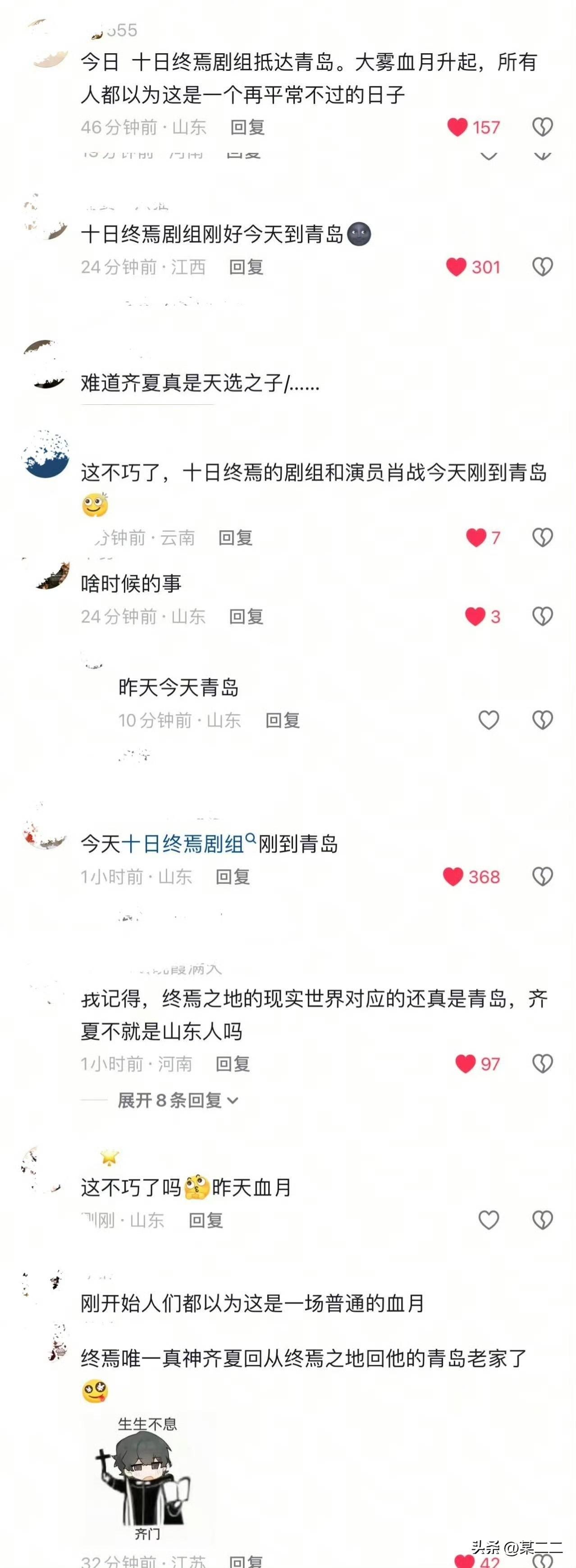 肖战身上真的有点玄学[捂脸][捂脸][捂脸]十日终焉剧组今天刚到青岛,一个平平无奇的日子,昨天大雾血月升起。这不就巧了吗,十日终焉主角齐夏就是山东人,终焉之地的唯一真神回他的青岛老家了[呲牙]这下更说不清了,完了,我战是天选之子的视事情瞒不住了!!!