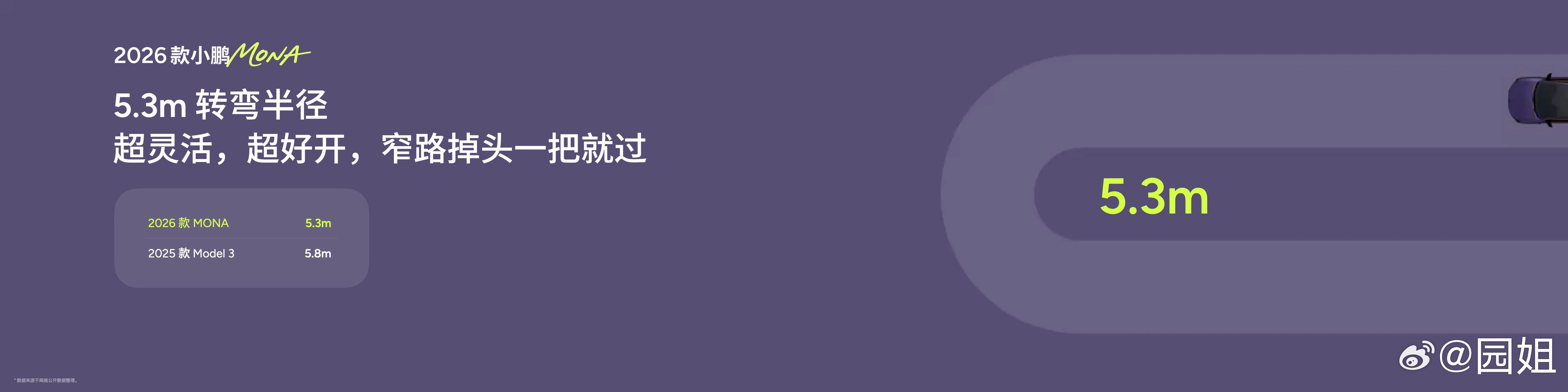 新款小鹏MONA升级自适应阻尼减振器,5.3m最小转弯半径和35.63m百公里刹停距离使其兼顾乘坐舒适体验与驾控信心。#2026款小鹏MONA今日上市##2026款小鹏MONA大大大大大升级#