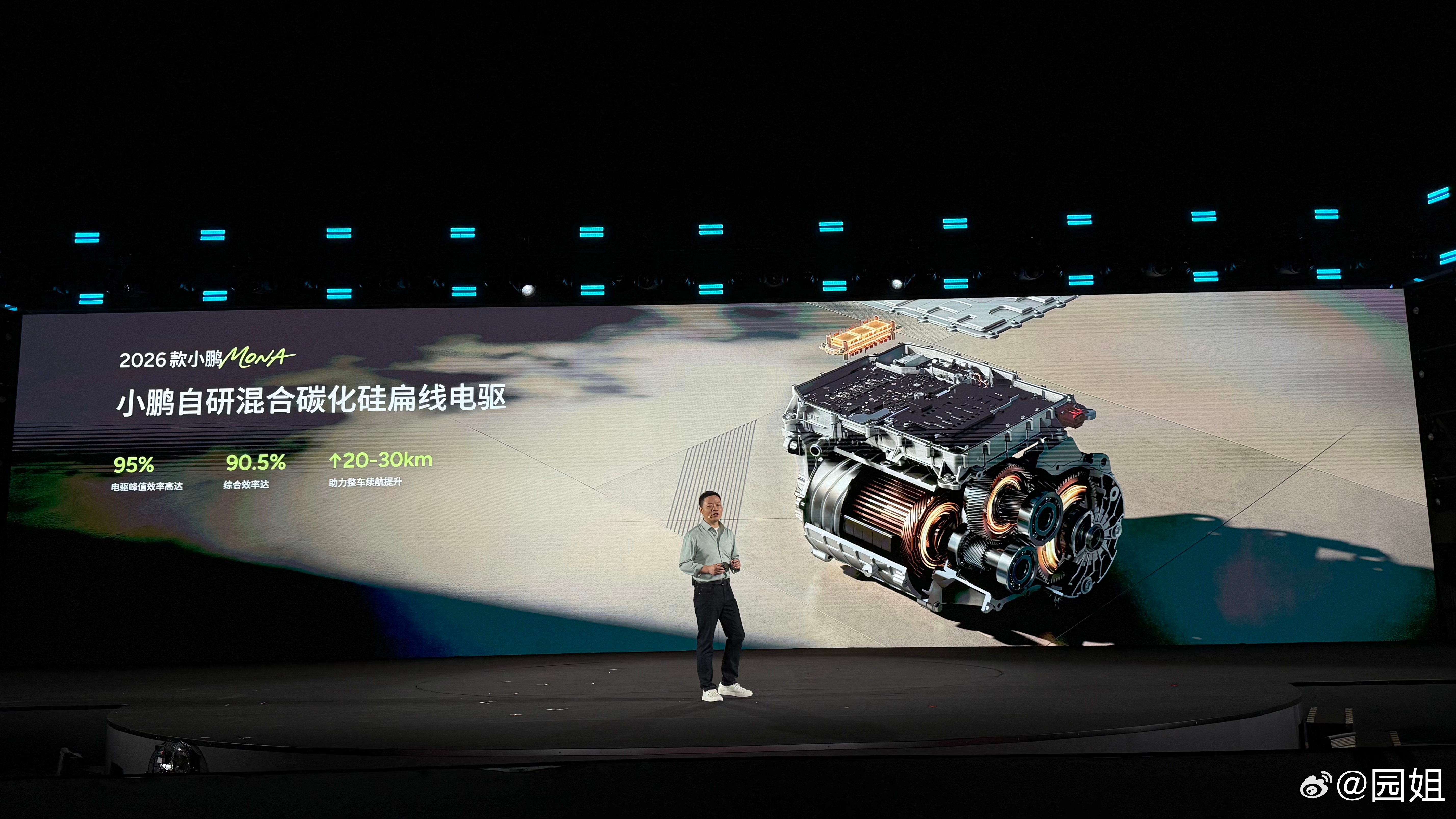 2026款小鹏MONA M03搭载小鹏自研的混合碳化硅扁线电驱系统,电驱峰值效率达到95%,续航可提升20–30km,CLTC综合续航里程最高可达640km,升级热泵空调,冬天开暖风电耗降低50%,冬季续航至高提升30km,百公里综合电耗10.8kWh。
