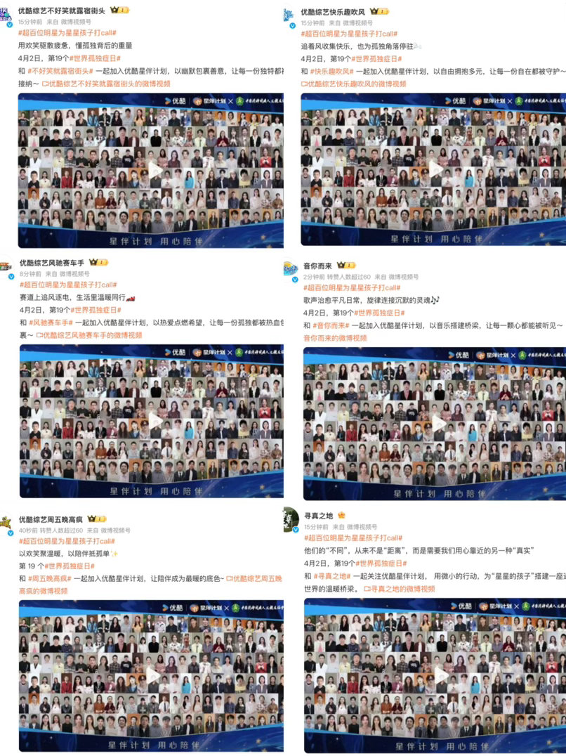 优酷用陪伴温暖星星的孩子以爱相伴,守护星光。优酷星伴计划联动百位明星发声,打造温暖开放日,点亮城市蓝灯,用实际行动关爱孤独症群体。从号召到践行,从关注到陪伴,优酷用真诚与坚持传递温暖,愿每一个“星星的孩子”都被世界温柔以待。