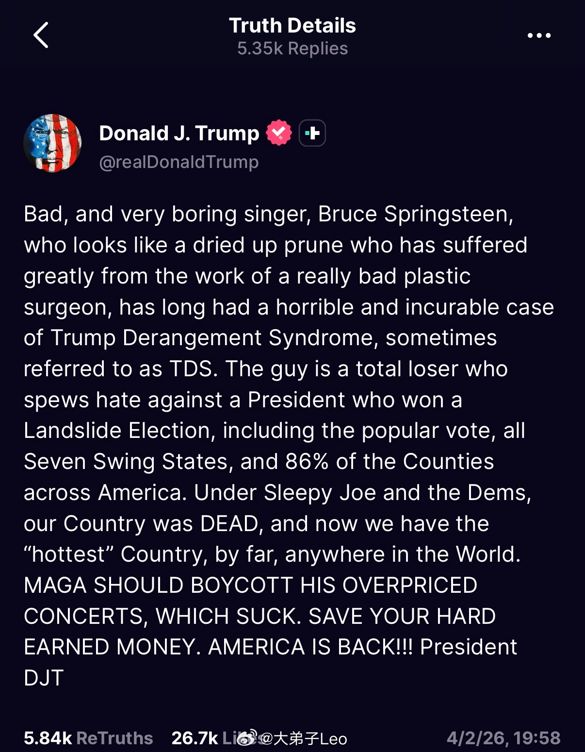“糟糕透顶且极其无聊的歌手布鲁斯·斯普林斯汀,长得像干瘪的西梅,还被糟糕透顶的整形医生整得惨不忍睹,他长期患有严重的特朗普妄想症,有时也被称为 TDS。这家伙是个彻头彻尾的失败者,对赢得压倒性大选、包括普选票、所有七个摇摆州以及全美 86%县的总统大肆谩骂。在瞌睡乔和民主党执政期间,我们的国家奄奄一息,而现在我们拥有了全世界最“火”的国家。MAGA 应该抵制他那些价格虚高的演唱会,那玩意儿简直糟糕透顶,省省你们辛苦挣来的钱吧。美国回来了!!!”
