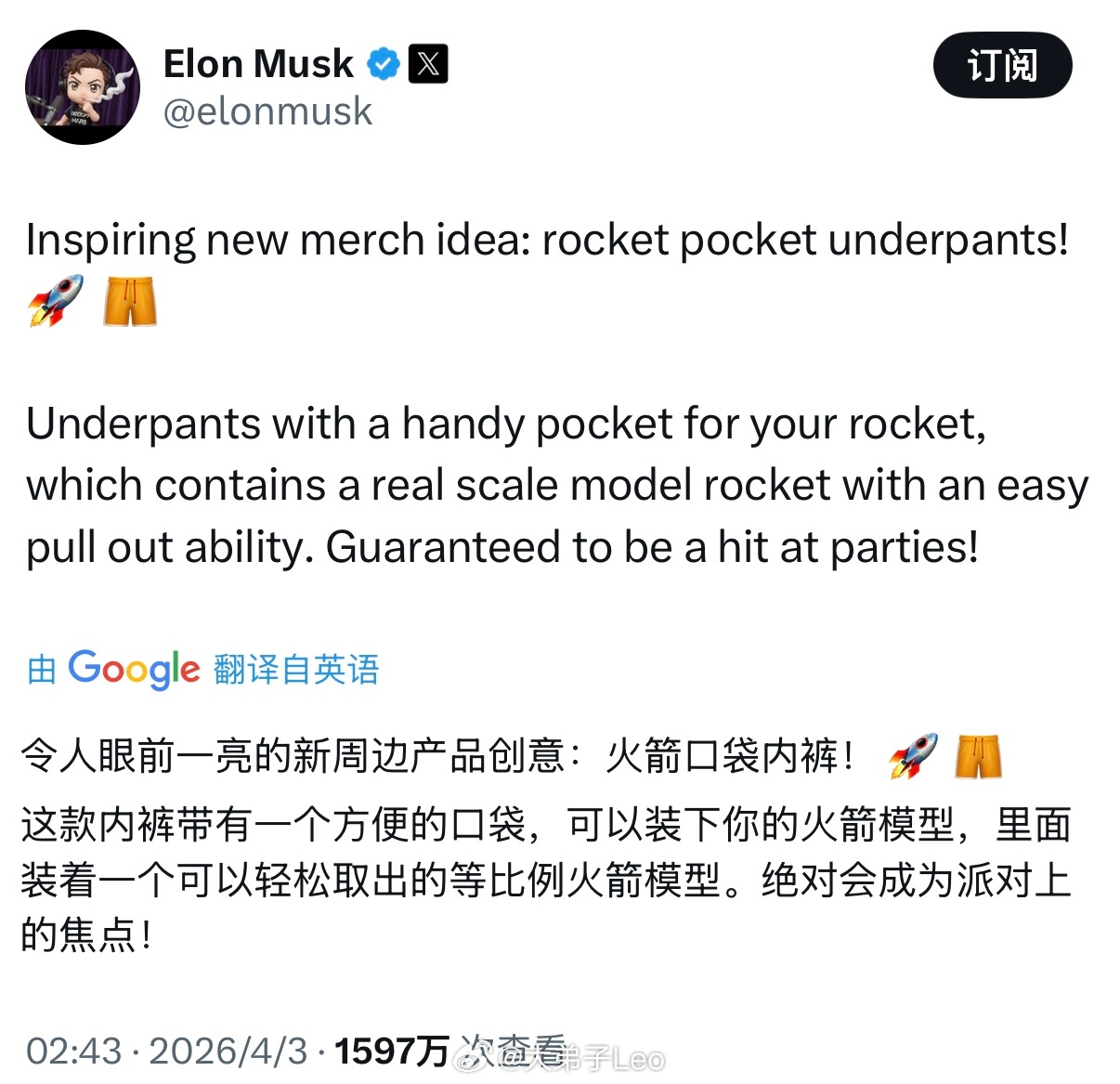 马斯克强烈推荐创意产品火箭口袋内裤,“这会让你成为派对上的焦点”