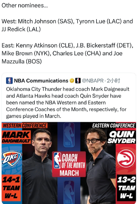 三月东西部最佳教练,戴格诺特与斯奈德当选,雷迪克获得提名!