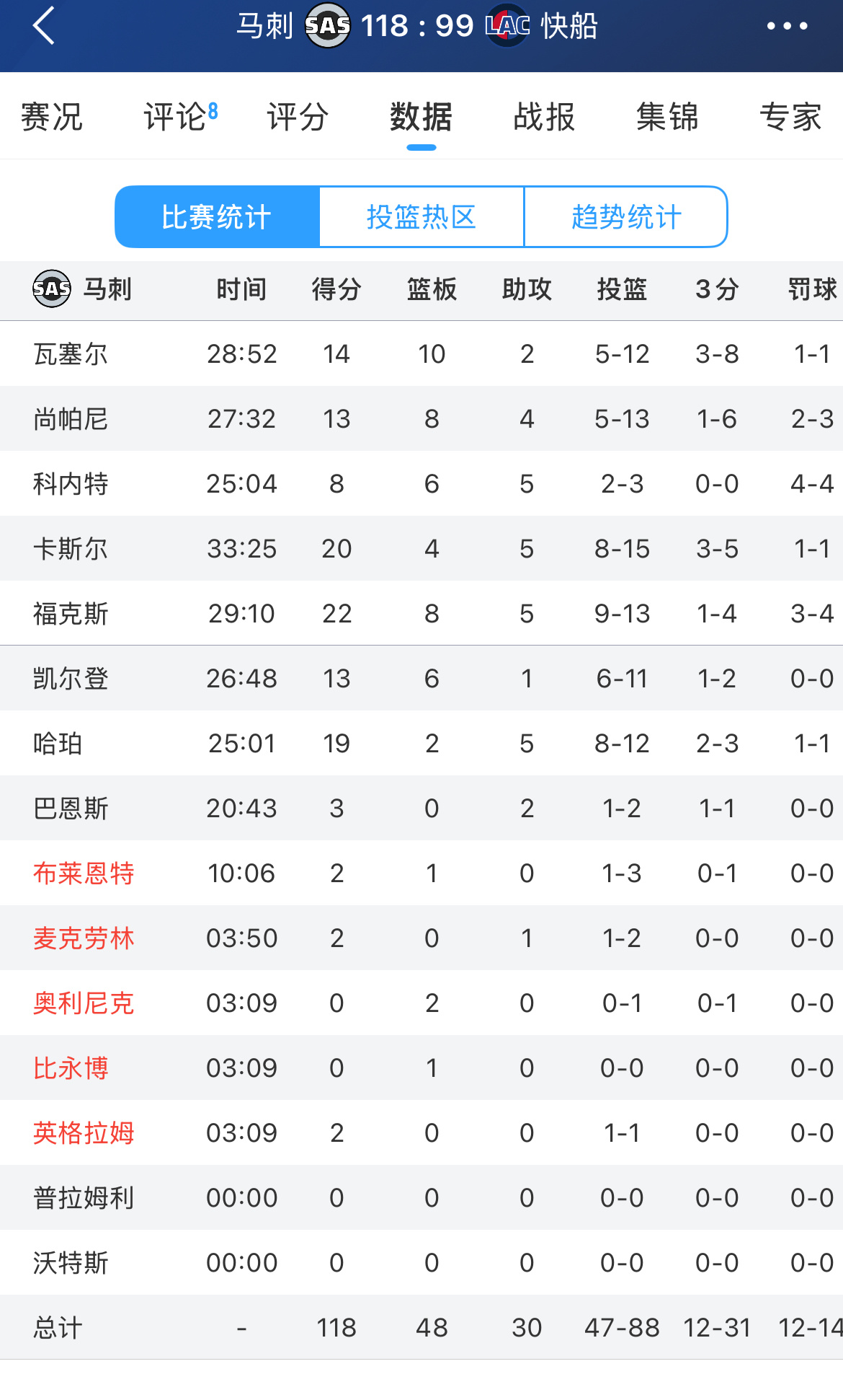 福克斯22分,卡斯尔20分,迪伦-哈珀19分马刺vs快船