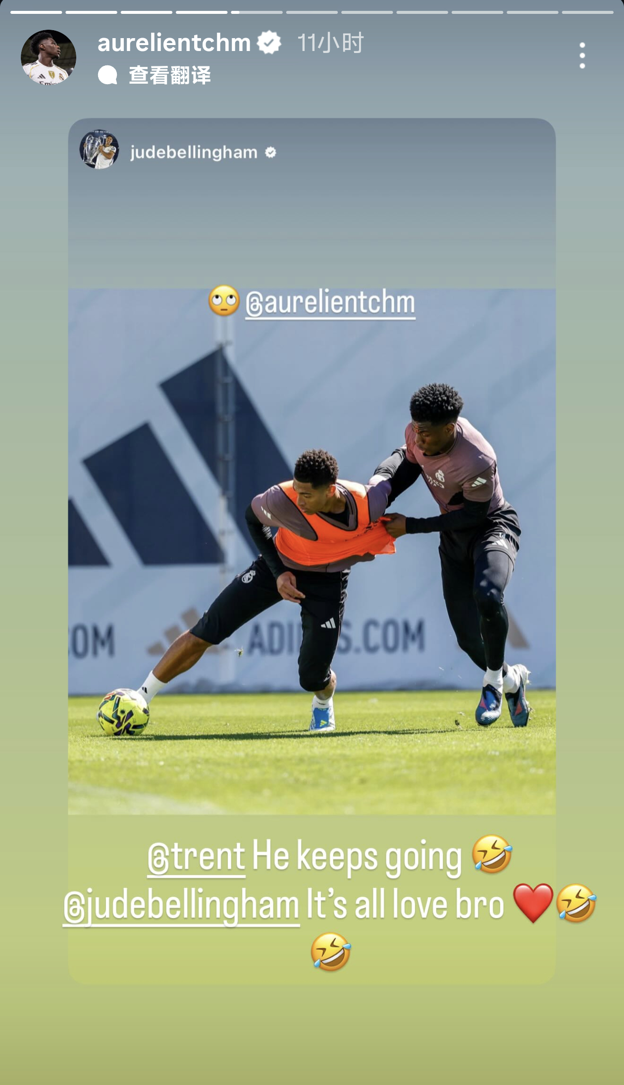 昨天训练时被楚阿梅尼拉了球衣,在快拍艾特楚阿梅尼并翻了个白眼🤣楚阿梅尼转发,艾