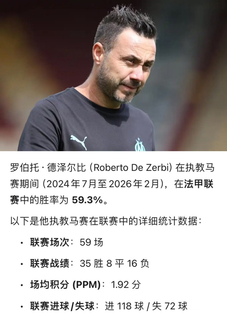 好消息:德泽尔比执教马赛的联赛胜率达到了59.3%坏消息:图多尔执教马赛的联赛胜率也有57.89%
