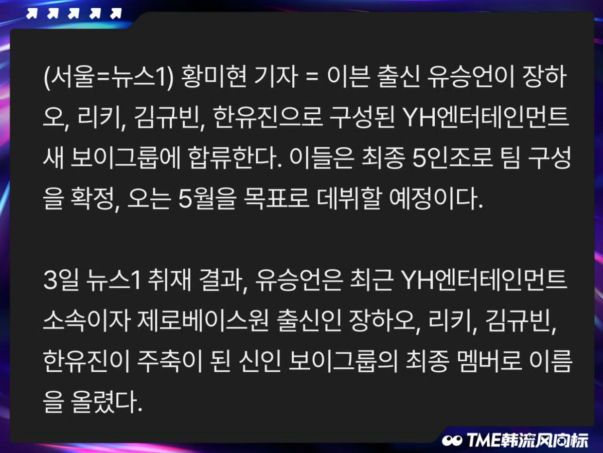 AND2BLE将5人出道 乐华新男团将5人出道 AND2BLE已确认为5人组体制✨由章昊、RICKY、金奎彬、韩维辰及前EVNNE成员刘昇彦组成,预计今年5月出道~ 刘昇彦加入AND2BLE