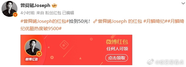 曾舜晞破万又发红包了 曾舜晞破万又发红包了,发了好多好多的红包了呀,这次《月鳞绮