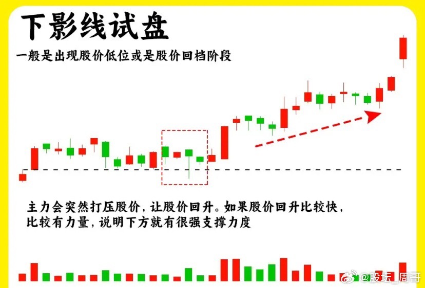 股价在盘中,快速下跌,下影线一般会比较长,但是有能在盘中快速收回,最后就形成一个下影线比较长,实体部分比较小的K线,当然也会出现变异的情况,比如十字星,T字形。下影线代表下方承接力量的强弱,说明支撑越强。