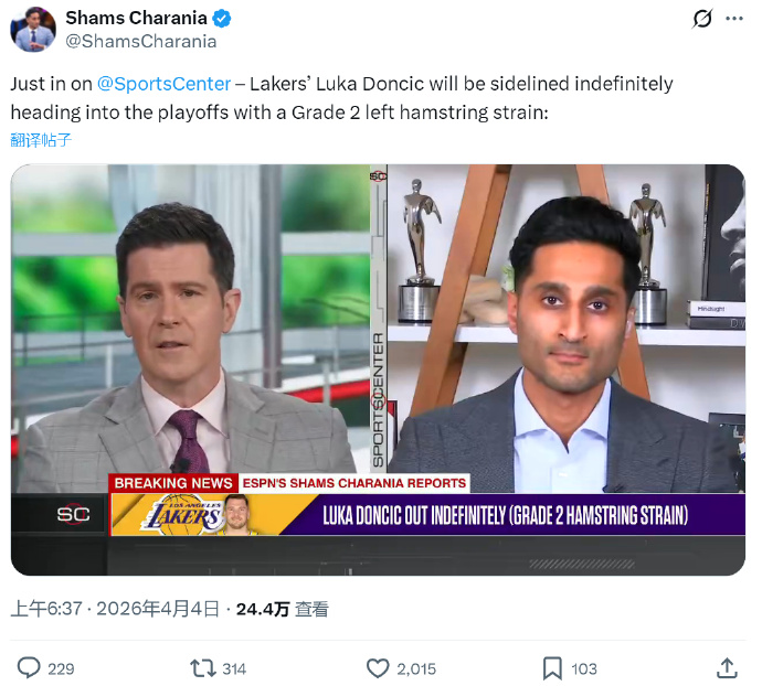 NBA名记Shams与Dave McMenamin联合报道,湖人球星东契奇被诊断为左腿筋二级拉伤,不仅常规赛报销,季后赛也是无限期缺阵。腿筋二级拉伤在NBA的平均缺席时间为35天,大约15场比赛。