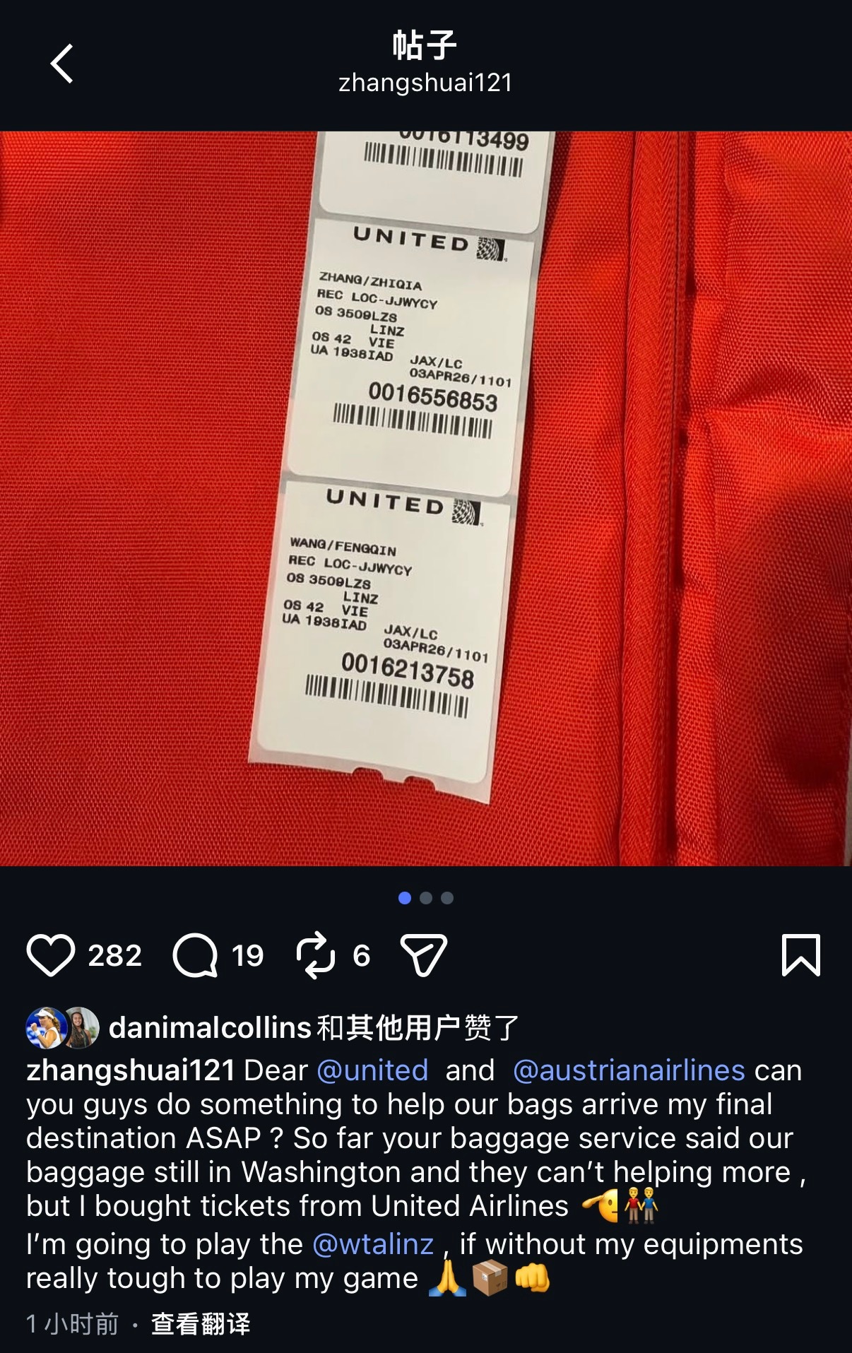 “尊敬的美联航和奥地利航空,能否请你们帮忙尽快把我的行李送到最终目的地?到目前为止,你们的行李服务部门说我们的行李还在华盛顿,而且他们无法提供更多帮助,但我是从联合航空买的机票。我要去参加WTA林茨站比赛,如果没有我的装备,真的很难打比赛。”