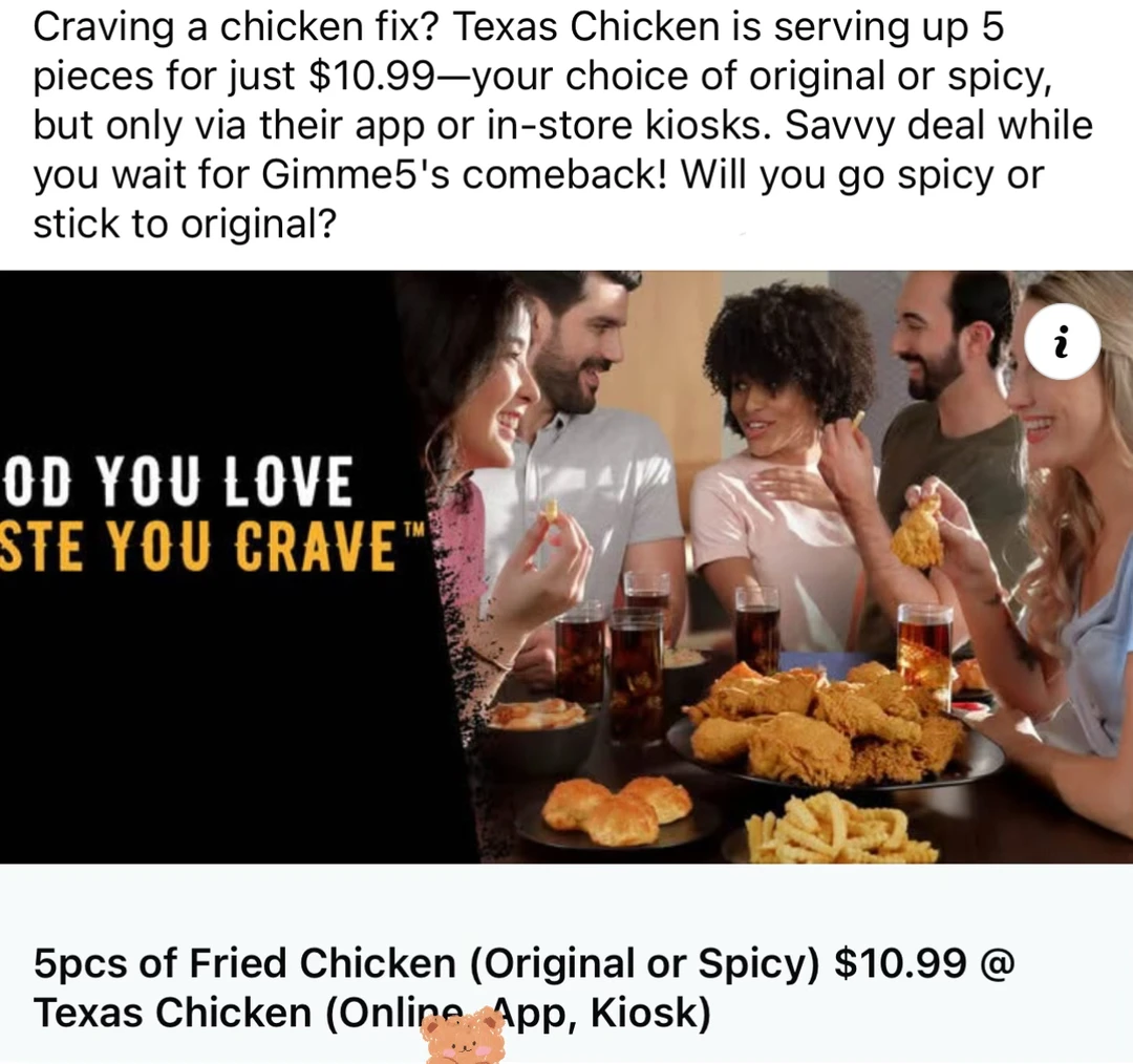 德州炸鸡控快看过来!发现了隐藏折扣! 超值deal——5块炸鸡只要$10.99‼️ 可以选择原味或者辣味,酥脆多汁[色色R] 不过要注意⚠️:这个优惠只能在他们的线上或者店内自助点餐机上使用哦! 算下来单块才$2出头,比单点划算太多啦[暗中观察R] 等不到Gimme5回归的日子,就靠它解炸鸡瘾了![赞R] 关注我,下一篇更精彩