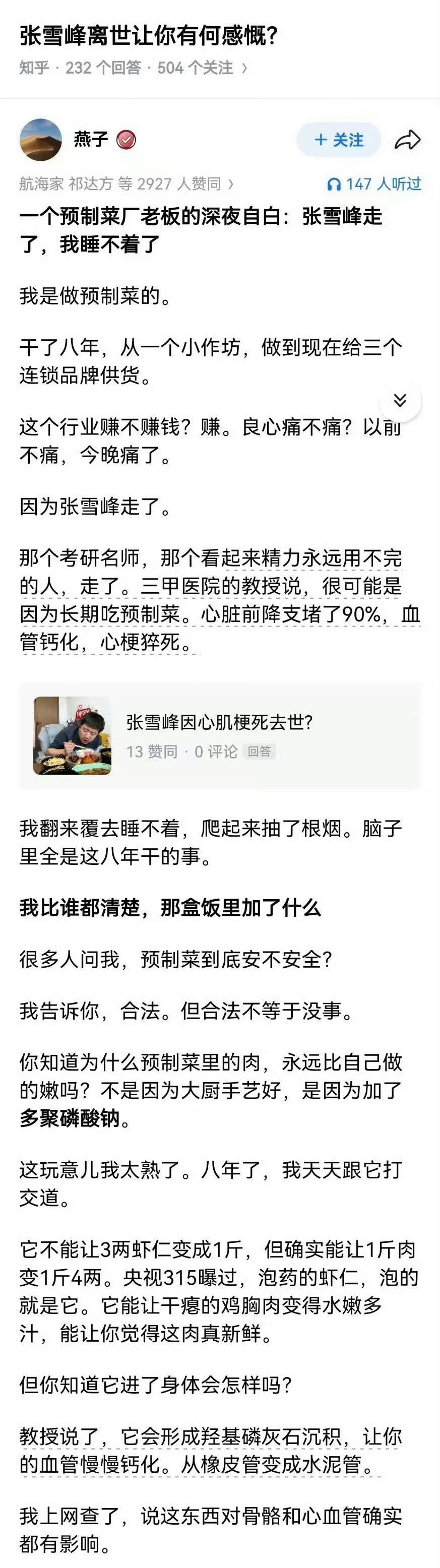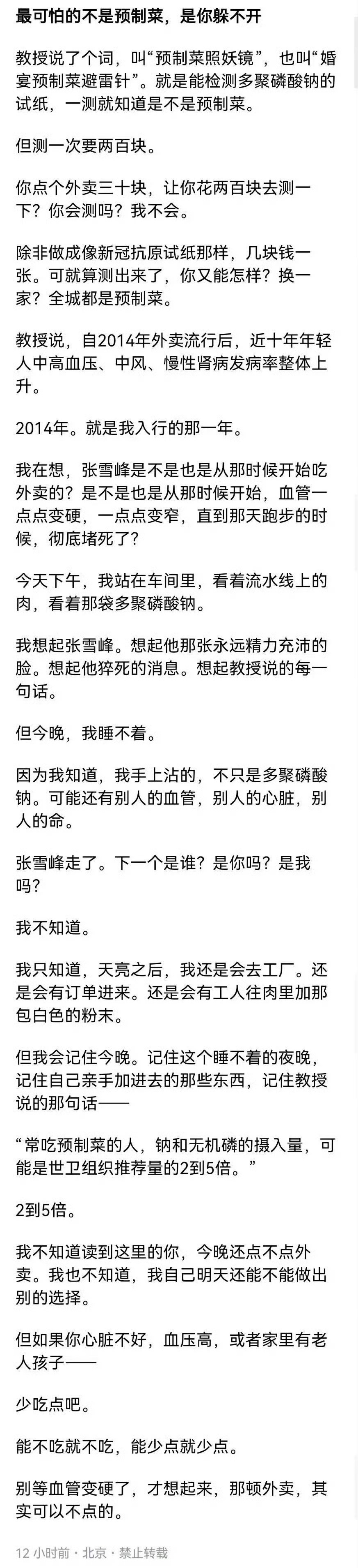 张雪峰离世,居然引发一个预制厂老板的深夜自白,称预制菜合法但不等于没事,并提醒网友:为了健康,少点外卖。满谈健康