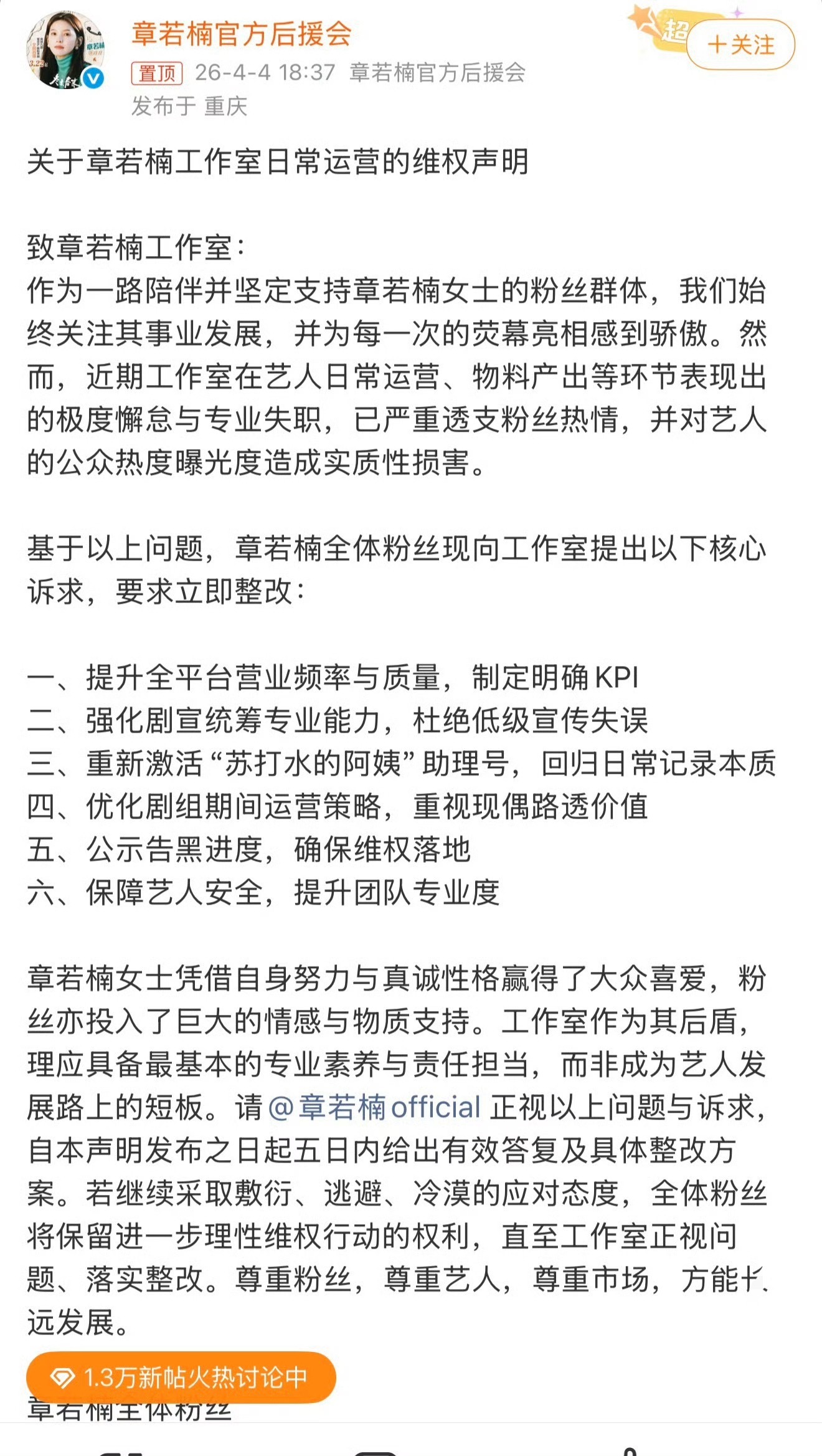 看到了章若楠后援会维权声明,到底怎么了啊?觉得工作室能力不足吗?