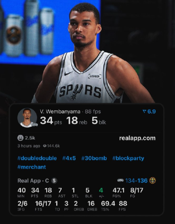 而逼出上述一切的是出战39分36秒拿到34分18篮板7助攻5盖帽1失误的文班亚马,是加时赛5人得分、全场7人上双的年轻马刺。