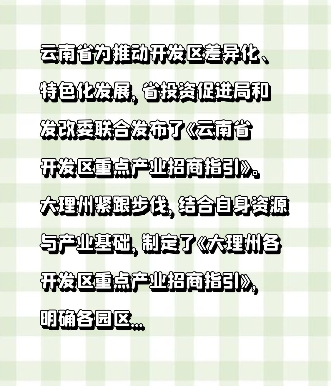 【大理州各开发区重点产业招商指引发布】 云南省为推动开发区差异化、特色化发展,省投资促进局和发改委联合发布了《云南省开发区重点产业招商指引》。大理州紧跟步伐,结合自身资源与产业基础,制定了《大理州各开发区重点产业招商指引》,明确各园区主导产业定位。 2026 年是“十五五”开局之年,也是云南的“项目攻坚年”,全省开展“九大攻坚行动”。在这样的大环境下,大理州的招商指引无疑是为当地产业发展注入新动力,有望吸引更多优质企业,构建优势互补、错位协同的园区发展新格局,推动当地经济高质量发展。 大理 开发区 招商引资 重点产业