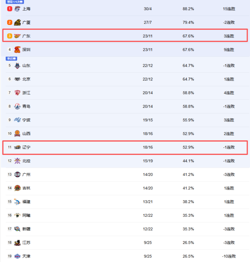 深圳绝杀北控豪取9连胜目前稳定在第四!这赛季最大惊喜就是深圳和宁波,这两队表现不输一些豪门,也期待他们在季后赛舞台大施拳脚。而辽宁的处境和广东是冰火两重天!较为尴尬。球队已失去冲击前6希望,本轮又被山西反超,排名跌至第十一。
