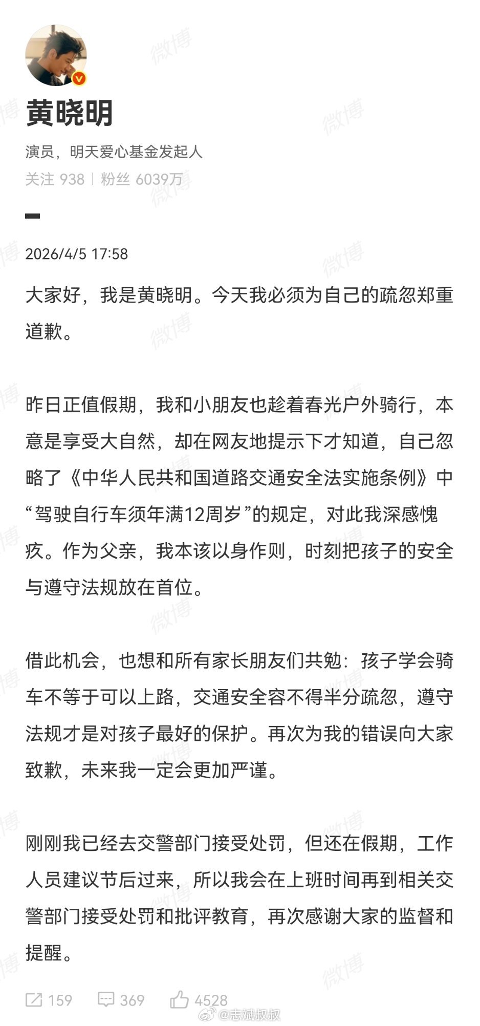 毕竟明星作为公众人物,这波也是起了警醒作用。。 黄晓明带9岁娃骑行再温馨也违法 黄晓明就带娃骑行道歉 广州