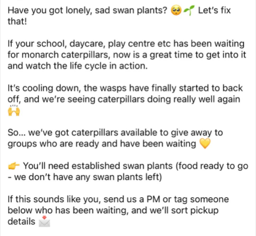 谁懂啊!能亲眼看着毛毛虫→蛹→蝴蝶的完整蜕变,对小朋友来说真的是超震撼的自然启蒙! 这家新西兰农场直接免费给学校、幼儿园、早教中心送帝王蝶幼虫啦[赞R] 现在时机刚刚好:天气转凉,黄蜂活动减少,毛毛虫现在长得超健康~ [向右R]需要有成熟的马利筋(swan plants)他们不提供植物 [拔草R] 直接私信农场,就能约自提细节,给娃安排上这场超治愈的生命观察课! ● 适合学校、日托、早教中心,赶紧冲![赞R] 关注我,下一篇更精彩