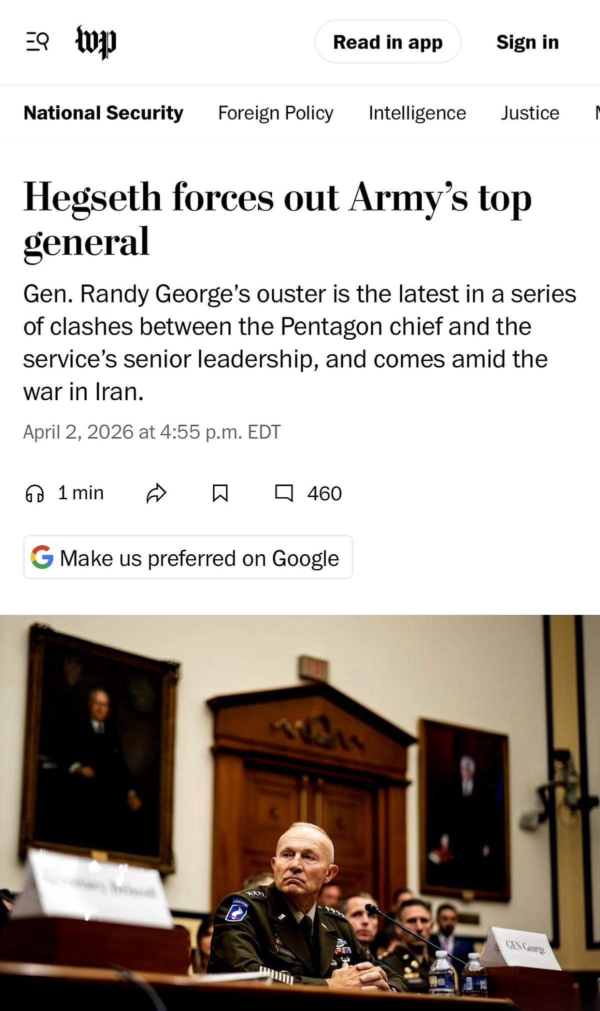 美军陆军参谋长,四星上将兰迪·乔治,被国防部长皮特·赫格塞斯直接通知:你可以提前退休了。 没有任何废话,没有一丝缓冲。 就在跟伊朗开战的节骨眼上,指挥陆军的总司令,直接被自己人从指挥席上拽了下来。 这事还没完。这根本不是点对点的清除,这是一场席卷五角大楼的风暴。乔治,只是倒下的多米诺骨牌里,比较响的一块。 就在不久前,海军最高将领丽莎·弗兰切蒂,被解职。空军二号人物吉姆·斯菲,被解职。连参谋长联席会议主席布朗将军,都被总统亲自端掉。 那段时间,五角大楼的电话线估计是烫的,十几名高级将领和海军上将,要么自己提前递了辞呈,要么就接到了“被退休”的通知。整个指挥系统,几乎被连根拔起换了一遍土。 被拔掉的乔治,什么来头?西点军校毕业,一路从步兵军官干起,打过第一次海湾战争,在伊拉克和阿富汗的沙尘里滚过。他甚至还当过前任国防部长奥斯汀的高级军事助手。一个履历完美、从枪林弹雨里爬出来的职业军人,连一场体面的告别都没有。 更有意思的是他副手的位置。副参谋长詹姆斯·明格斯,干了不到两年,也被突然换掉。接替他的人叫克里斯托弗·拉内夫。 拉内夫中将,调任前的身份是:国防部长赫格塞斯的高级军事助手。 这一下,所有人都看懂了。 这不是简单的换人,这是在往关键位置上,插上自己的销钉。 战场上临阵换将,兵家大忌。但在办公室里,这可能只是一场冷冰冰的权力交接。