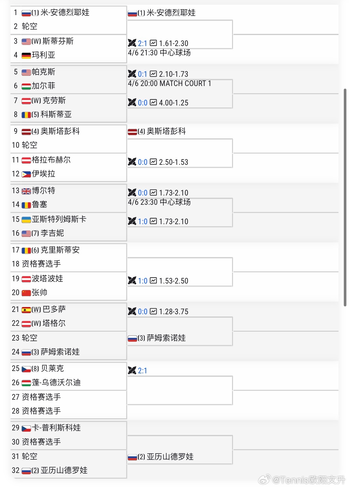 💃🏻女双【1】🇨🇳张帅/🇷🇴科斯蒂亚vs🇺🇸沃雷涅茨/斯蒂芬斯🇨🇳汤千慧/🇵🇱皮特vs🇯🇵二宫真琴/🇬🇧拉姆斯登🇨🇳杨钊煊/梁恩硕vs🇷🇺克罗玛查娃/🇲🇽沃尔莫斯
