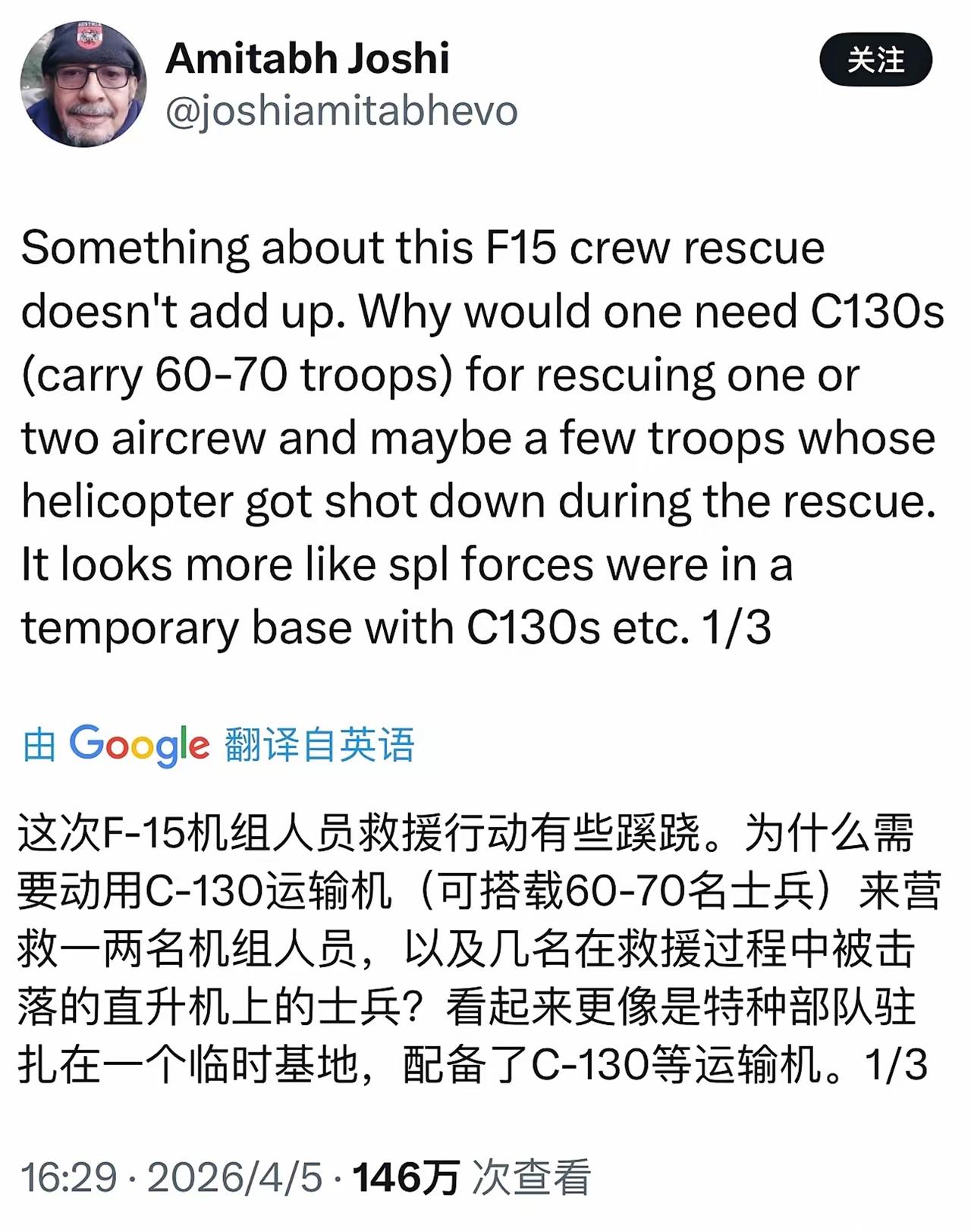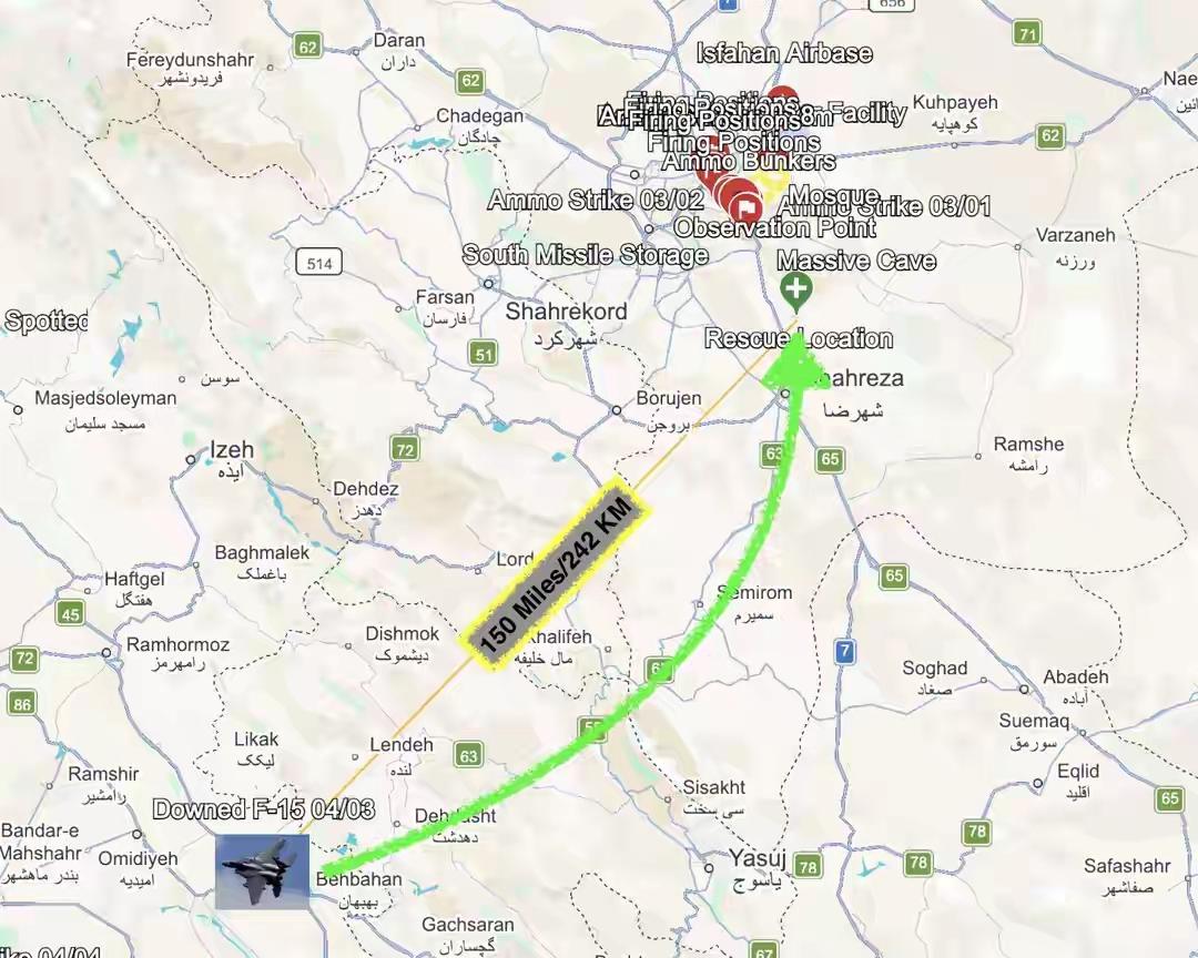 F - 15E战斗机的第二名机组人员,为求获救,在24小时内朝北移动150英里,到达了距美国持续轰炸整周的伊朗革命卫队伊斯法罕导弹基地仅19英里之处。又是出动大型运输机,又是修建临时跑道,这般大张旗鼓营救一名飞行员,怎不令人心生疑虑?