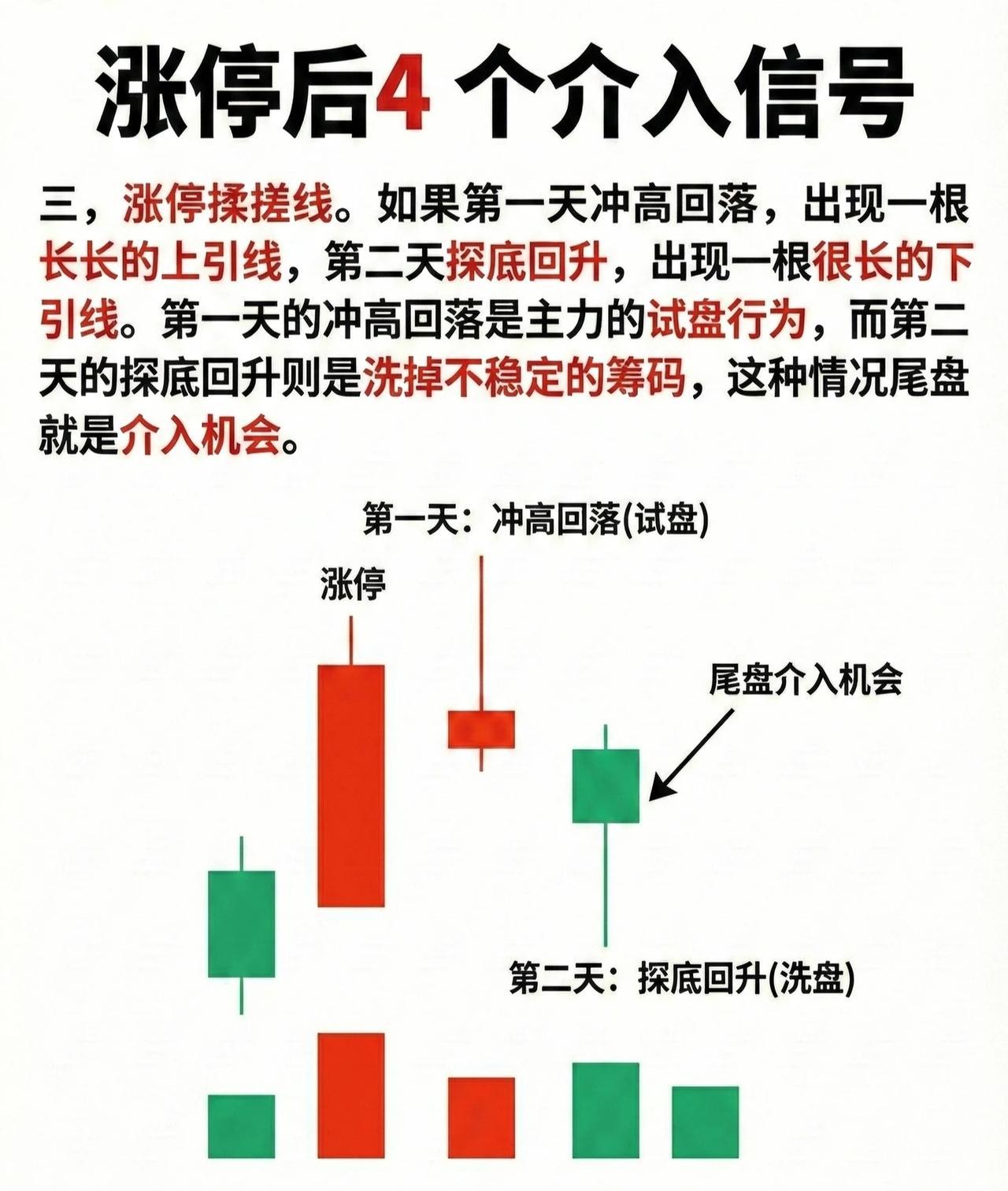 (图示逻辑:涨停→长上影试盘→长下影洗盘→尾盘介入,确认资金意图。)