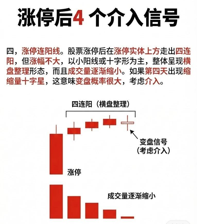 股票涨停后,在涨停实体上方走出4根小阳线(或十字星),涨幅温和(整体呈横盘整理形态),且成交量逐渐缩小(量能递减,说明抛压减轻)。若第4天(或整理末期)出现缩量十字星,则意味着“变盘概率大幅提升”,可考虑介入。