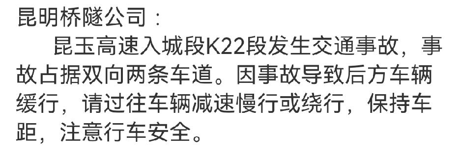 📍【实时突发路况】昆玉高速又出状况了! 昆明桥隧公司消息,昆玉高速入城段K22段发生交通事故,双向两条车道被占,后方车辆都缓行了。 其实昆玉高速这路况一直不太让人省心。2025年11月4日,玉溪至昆明方向k58+444有肇事护栏板更换施工,占了左侧行车道。4月24日,K29公里处一辆货车侧翻还影响了双向车道。 大家经过这儿可得多留意,减速慢行或者干脆绕行,保持好车距,安全第一啊,谁也不想堵在路上干着急。