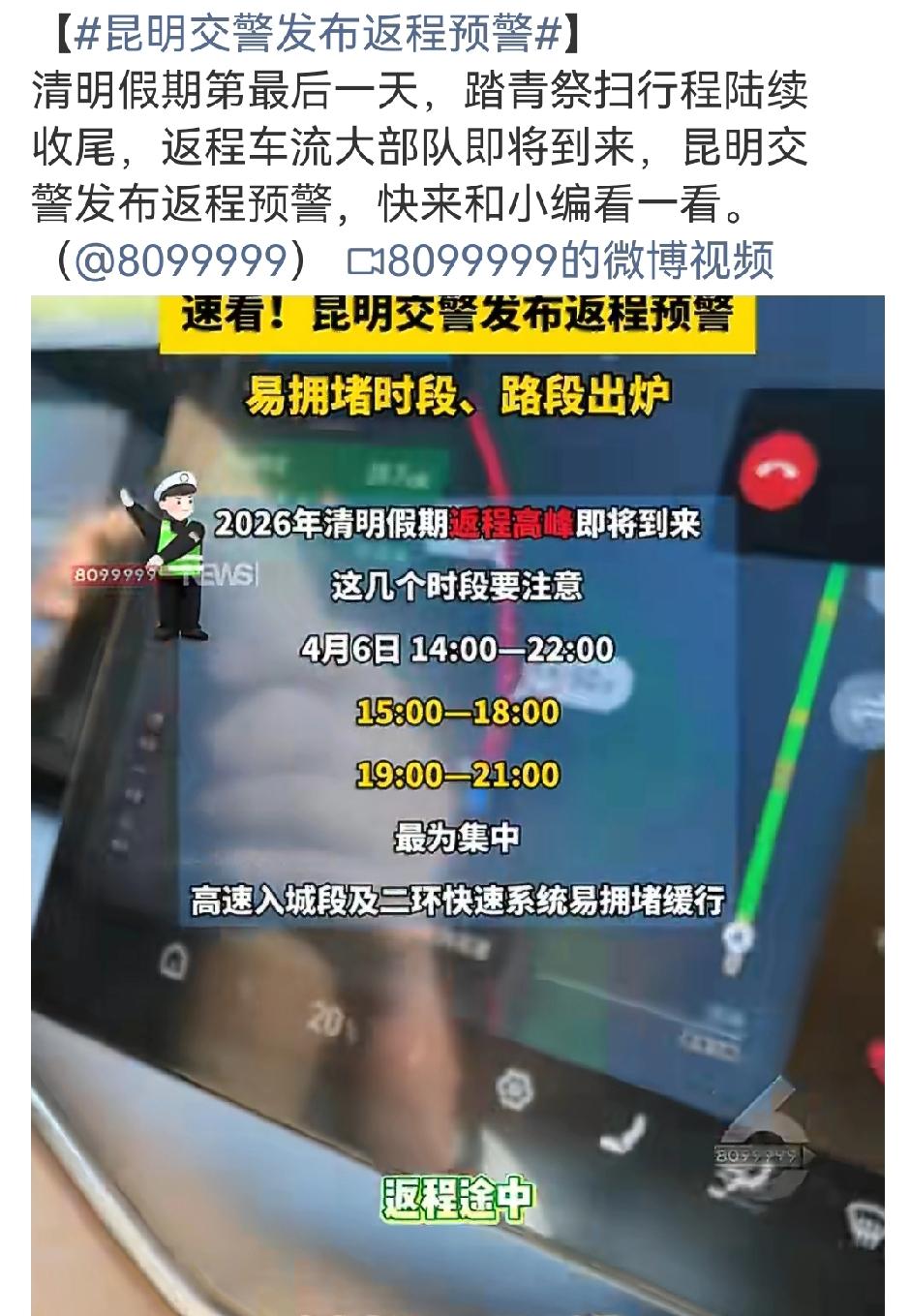 清明假期的最后一天,昆明交警发布的返程预警十分及时!2026年清明假期,7座及以下小型客车可享受高速免费政策,免费时段为4月4日0时至4月6日24时。 预计全省普通国省干道日均车流量约230.06万辆,高速出口日均车流量约237.78万辆。环昆高速流量呈现“头尾高峰”态势,4月6日15时至21时为高速返程高峰时段,出入昆高速将会处于超饱和状态。 云南交投也提醒,4月6日14:00至18:00是返程高峰期,昆石、昆安等高速以及景洪东、墨江等收费站易出现拥堵情况。大家返程时一定要合理规划路线,避开高峰时段!