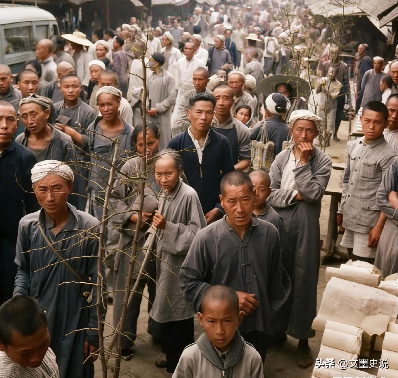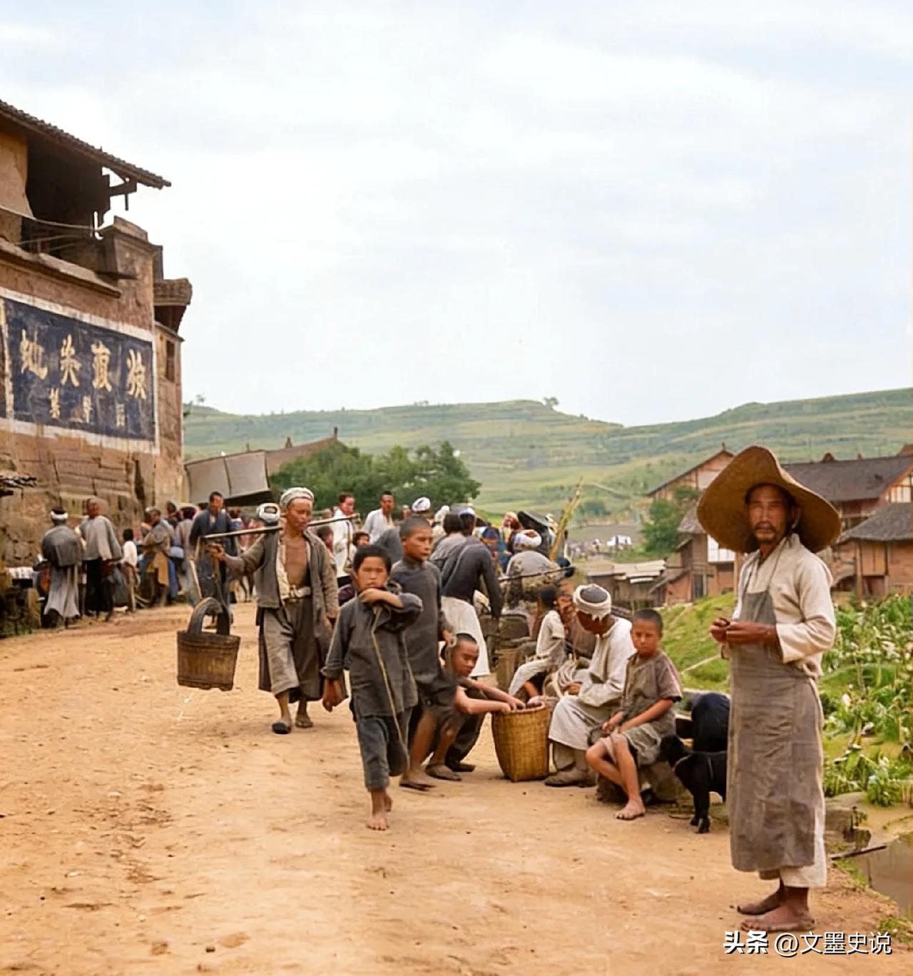 挑着担子的行人走过土坡,孩童们光着脚跑过街头;妇人蹲在河边洗衣,竹筐背在背上,水花溅湿了她的裤脚;囚笼里的人望着镜头,远处的士兵握着枪,沉默地站在原地。茶馆里,老人端着碗喝茶;巷口的药铺里,伙计站在柜台后,身后的玻璃罐里装满了零食。