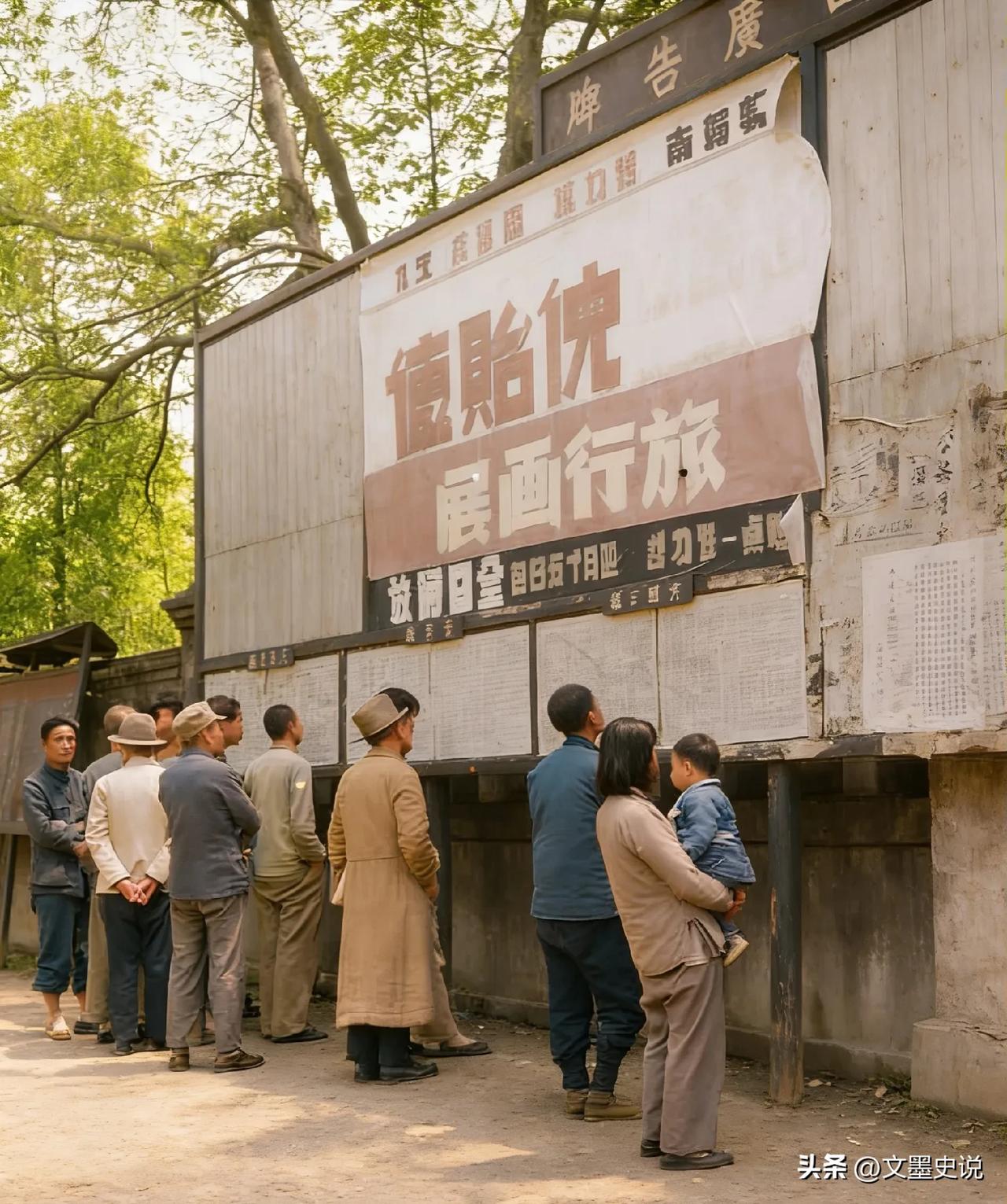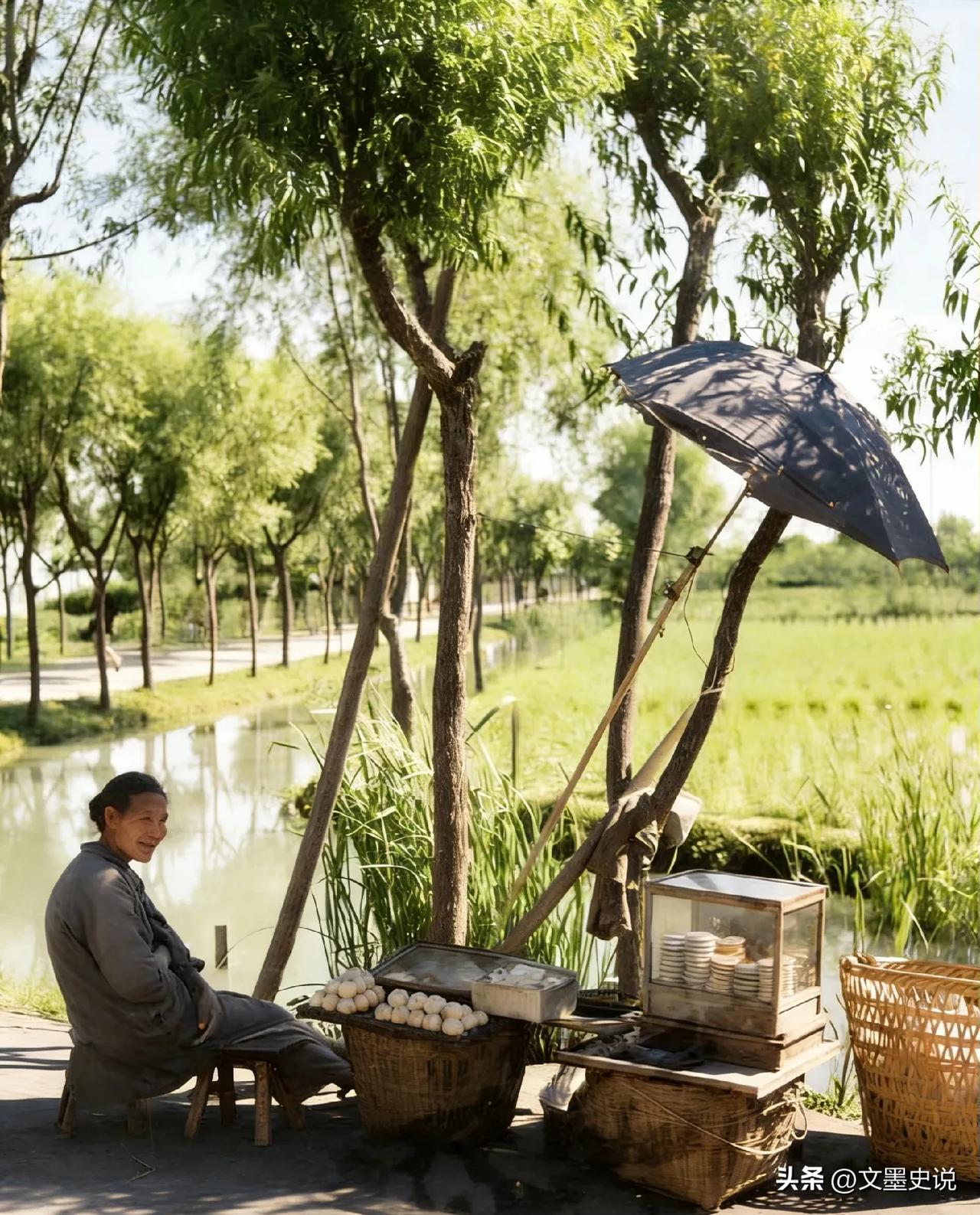 巷口的水果摊支起旧伞,妇人坐在矮凳上,竹筐里的橘子码得整整齐齐,一旁的玻璃柜里,是待售的点心。田埂边,水牛拖着犁耙踩过水田,农人戴着斗笠,脚边溅起细碎的泥点,远处的山峦在薄雾里若隐若现。黄包车夫拉着车穿过街巷,扬起的尘土里,是奔忙的生计;街边的告示牌前,人们驻足看展览海报,纸页被风掀起一角。